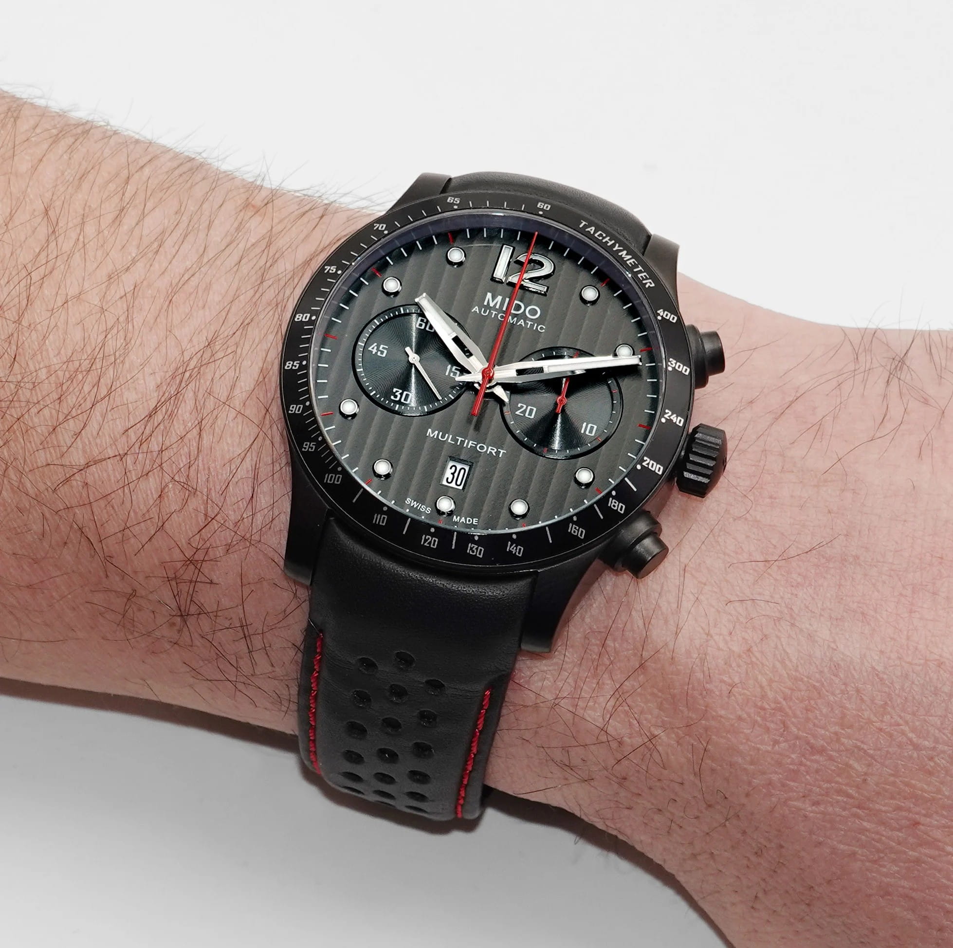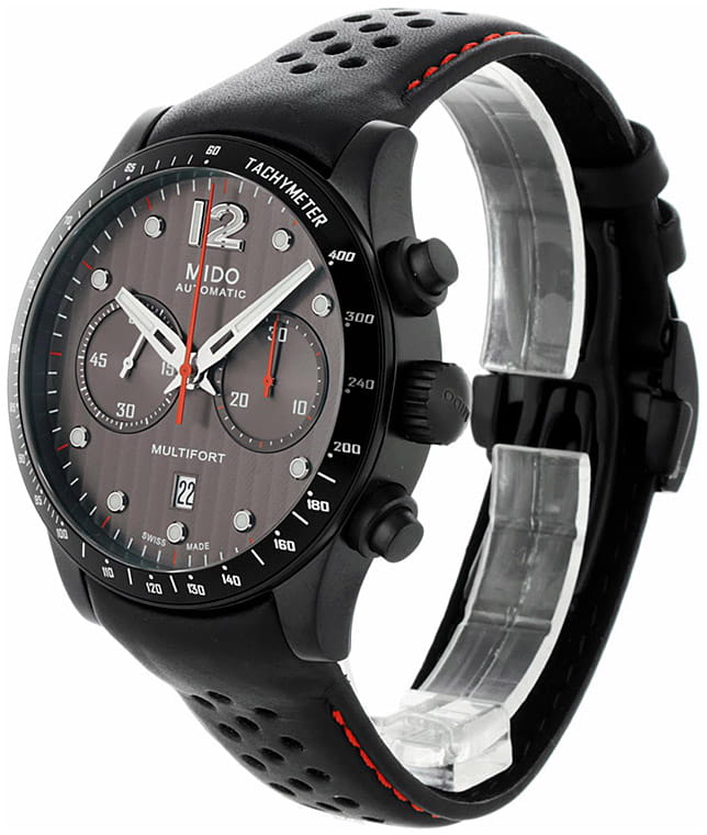 Часы Mido Multifort Chronograph M025.627.36.061.00 — это стильный мужской аксессуар, сочетающий швейцарское качество и современные технологии. Корпус диаметром 44 мм выполнен из нержавеющей стали с чёрным PVD-покрытиемPVDУльтратонкое покрытие наносится в технике вакуумного напыления, сочетает в себе нитрид титана особой прочности со слоем золота или оксида хрома. Несёт в себе декоративную или защитную функцию., что придаёт часам элегантный и прочный внешний вид. Чёрный циферблат с серебристыми стрелками и индексами защищён сапфировым стекломСапфировое стеклоПрочный и надёжный материал из кристалла сапфира синтетического происхождения, характеризующийся особой твёрдостью и устойчивостью к царапинам и повреждениям., устойчивым к царапинам.