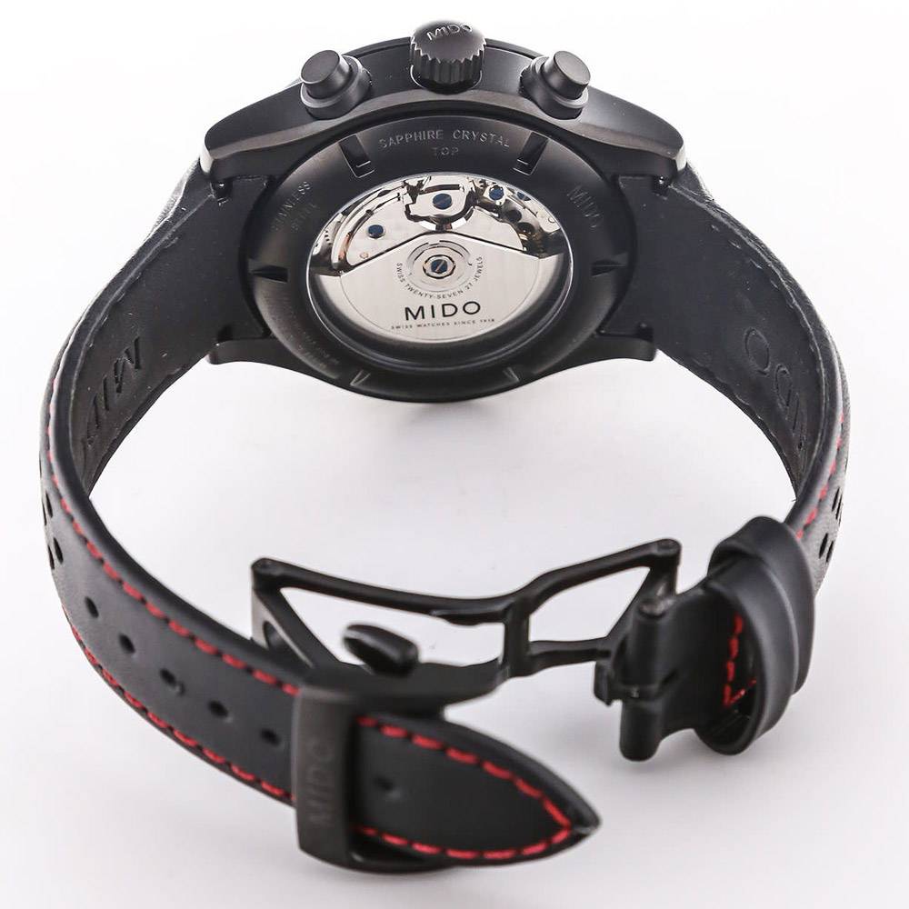 Модель оснащена автоматическим механизмом Mido Calibre 60 с запасом хода до 60 часов, который обеспечивает точность и надёжность. Функции хронографа включают 60-секундный и 30-минутный счётчики, а также тахиметрическую шкалу для измерения скорости. Окно даты на отметке 6 часов добавляет практичности.