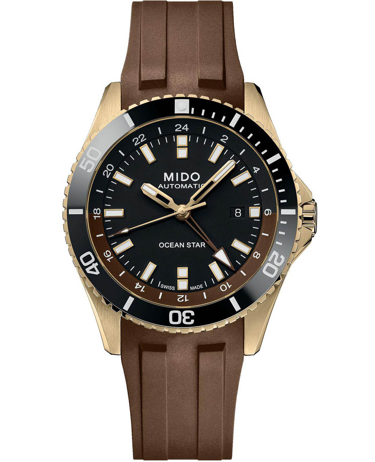 Часы MIDO Ocean Star GMT (артикул M026.629.37.291.00) сочетают элегантность и функциональность, идеально подходя для путешественников и любителей водных видов спорта. Корпус диаметром 44 мм выполнен из нержавеющей стали с керамическим безелем и водозащитой до 20 бар (200 метров). Завинчивающаяся заводная головка и накладные часовые метки, покрытые люминесцентным покрытиемЛюминесцентное покрытиеПозволяет считывать показания времени в темноте. Производители наносят на стрелки, часовые индексы, безель или поверхность циферблата светонакопительный состав, дающий холодное свечение.обеспечивают удобство и надёжность. Чёрный циферблат защищён сапфировым стекломСапфировое стеклоПрочный и надёжный материал из кристалла сапфира синтетического происхождения, характеризующийся особой твёрдостью и устойчивостью к царапинам и повреждениям.. Модель оснащена автоматическим механизмом MIDO Caliber 80, обеспечивающим запас хода до 80 часов. Функционал включает индикацию часов, минут, секунд, даты в положении «3 часа» и второго часового пояса GMTGMTОтображение времени второго часового пояса.Такая функция особенно актуальна для путешественников и бизнесменов,которые общаются с людьми из разных стран,теперь вы всегда будете знать,какой час у вашего партнёра или близкого человека.. Коричневый ремешок с раскладной застёжкойРаскладная застёжкаТакой тип застёжки используется только на браслетах из металла. Она никогда не раскрывается полностью, происходит разделение на 2 и более частей. Раскладывающая застёжка снизит вероятность потери часов к минимуму. с удлинением для дайвинга обеспечивает комфортное ношение и стильный внешний вид. На задней крышке выгравированы часовые пояса, что упрощает настройку времени при путешествиях. Эти часы идеально подходят как для повседневного ношения, так и для приключений.