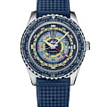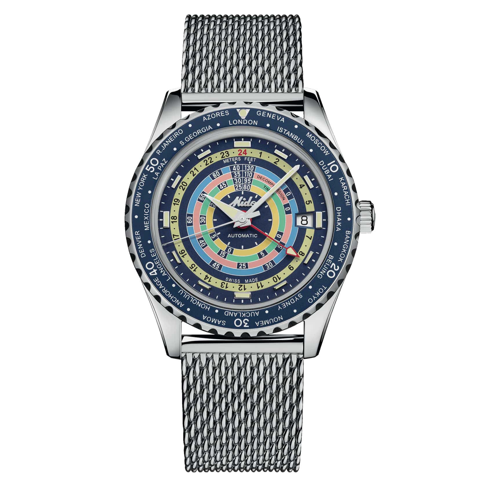 Часы MIDO Ocean Star Decompression Worldtimer (артикул M026.829.17.041.00) сочетают в себе винтажный дизайн и современные технологии, вдохновлённые оригинальной моделью 1960-х годов. Корпус диаметром 40,5 мм выполнен из нержавеющей стали с водозащитой до 20 бар (200 метров). Завинчивающаяся заводная головка и многоцветный циферблат с декомпрессионными шкалами, накладными часовыми метками, покрытыми Super-LumiNova®Люминесцентное покрытиеПозволяет считывать показания времени в темноте. Производители наносят на стрелки, часовые индексы, безель или поверхность циферблата светонакопительный состав, дающий холодное свечение., защищён сапфировым стекломСапфировое стеклоПрочный и надёжный материал из кристалла сапфира синтетического происхождения, характеризующийся особой твёрдостью и устойчивостью к царапинам и повреждениям. с антибликовым покрытием.