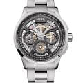 Швейцарские мужские наручные часы Mido Multifort Skeleton Chronograph M038.662.11.060.00, механический механизм с высокой точностью. Циферблат c сапфировым стекломСапфировое стеклоПрочный и надёжный материал из кристалла сапфира синтетического происхождения, характеризующийся особой твёрдостью и устойчивостью к царапинам и повреждениям., устойчивым к появлению царапин и обладающее высокой прозрачностью. Часы оснащены люминесцентным покрытиемЛюминесцентное покрытиеПозволяет считывать показания времени в темноте. Производители наносят на стрелки, часовые индексы, безель или поверхность циферблата светонакопительный состав, дающий холодное свечение., обеспечивающим отличную видимость даже при слабом освещении. Класс водозащиты: 100 метров, позволит плавать, нырять и заниматься другими водными видами спорта. Корпус часов изготовлен из стали. Часы с балансом из Nivachron™Nivachron™Специально разработанный инновационный сплав Nivachron™ повышает устойчивость часов к воздействию магнитных полей., обеспечивающим высокую устойчивость к магнитным полям и ударам. Часы с функциями хронографаХронографФункция позволяет измерять отрезки времени с особой точностью: часы, минуты, секунды. Верным признаком хронографа является наличие на циферблате 3 дополнительных окошек-счётчиков. и тахиметраТахиметрРазмеченная шкала, располагается на ободке или безеле часов. Тахиметр позволяет рассчитать скорость на определённом участке пути, расстояние измеряется в километрах или милях.. Браслет из стали с раскладной застёжкойРаскладная застёжкаТакой тип застёжки используется только на браслетах из металла. Она никогда не раскрывается полностью, происходит разделение на 2 и более частей. Раскладывающая застёжка снизит вероятность потери часов к минимуму. обеспечивает комфортное ношение.