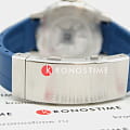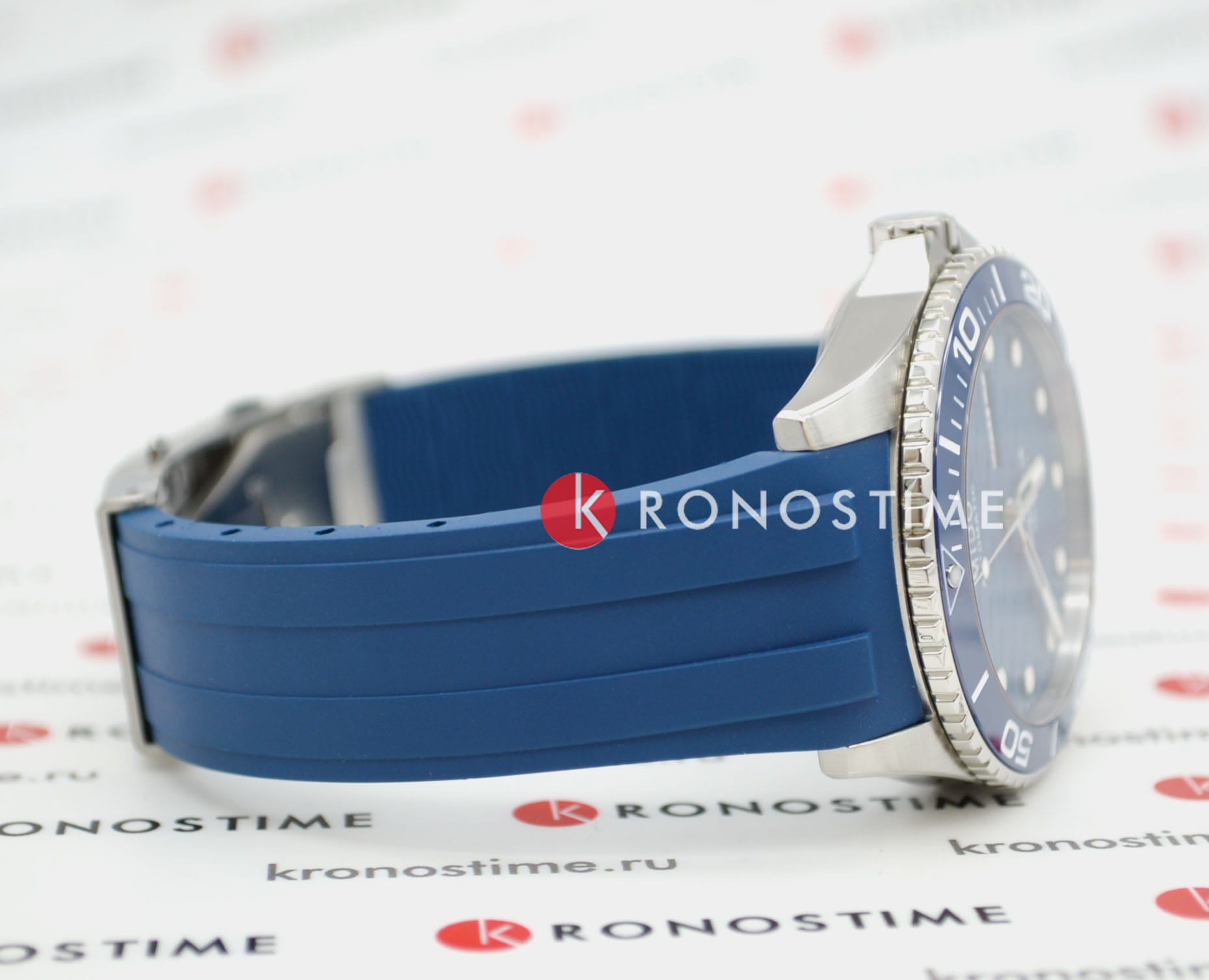 Ремешок из синего каучука с раскладывающейся застёжкойРаскладная застёжкаТакой тип застёжки используется только на браслетах из металла. Она никогда не раскрывается полностью, происходит разделение на 2 и более частей. Раскладывающая застёжка снизит вероятность потери часов к минимуму. и удлинением для дайвинга обеспечивает комфортное и надёжное ношение.