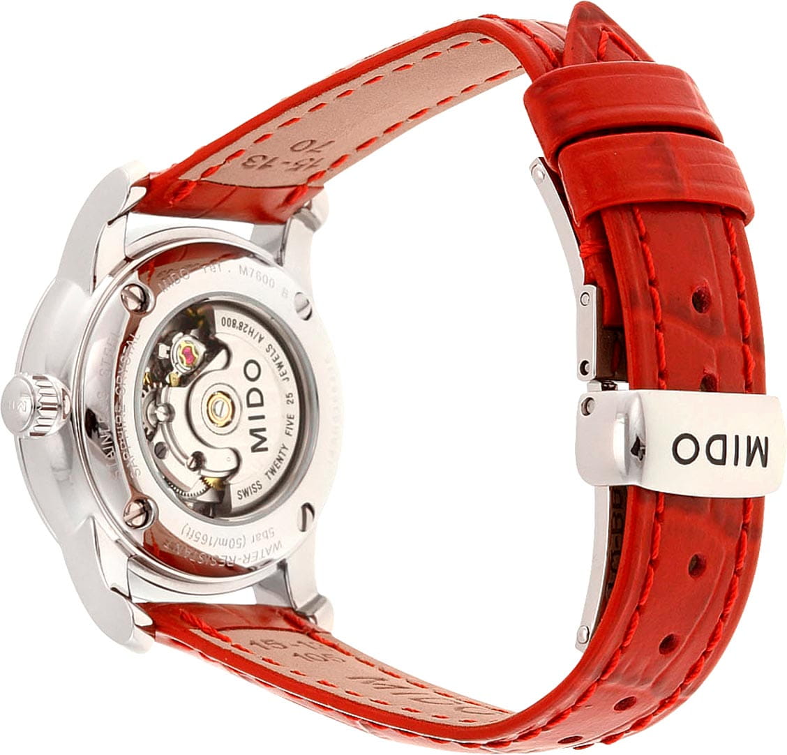 Женские швейцарские механические часы Mido Baroncelli Sz Lr A steel Lea.r M7600.4.39.7, автоматический механизм с высокой точностью. Сапфировое стеклоСапфировое стеклоПрочный и надёжный материал из кристалла сапфира синтетического происхождения, характеризующийся особой твёрдостью и устойчивостью к царапинам и повреждениям. устойчивое к появлению царапин, обладающее высокой прозрачностью. Класс водозащиты: 50 метров, позволит защитить корпус от случайных брызг или капель дождя. Корпус часов изготовлен из нержавеющей стали.