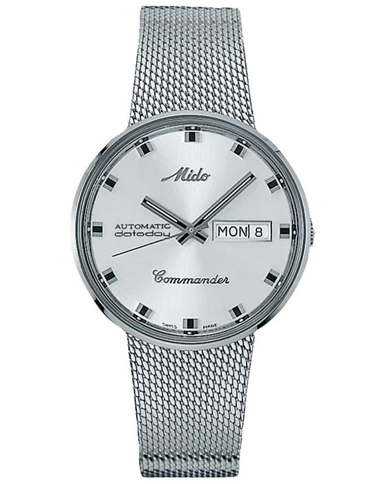 Циферблат с фирменным логотипом Mido 1950-х годов украшен накладными индексами и стрелками  с люминесцентным покрытиемЛюминесцентное покрытиеПозволяет считывать показания времени в темноте. Производители наносят на стрелки, часовые индексы, безель или поверхность циферблата светонакопительный состав, дающий холодное свечение., обеспечивающим читаемость даже в условиях слабого освещения. На «3 часах» расположено двойное окошко календаря — день недели и дата. Стальной браслет миланского плетения на раскладном замкеРаскладной замокДанный вариант застежки используется только на часах с металлическим браслетом. Отличительная особенность такого крепления в том, что длина браслета становится универсальной и вы можете самостоятельно отрегулировать нужный вам размер – застежка просто двигается по браслету часов..Модель защищена акриловым стеклом, сохраняющим аутентичный винтажный характер. Прозрачная задняя крышка открывает вид на автоматический механизм с автоподзаводом и 80-часовым запасом хода.