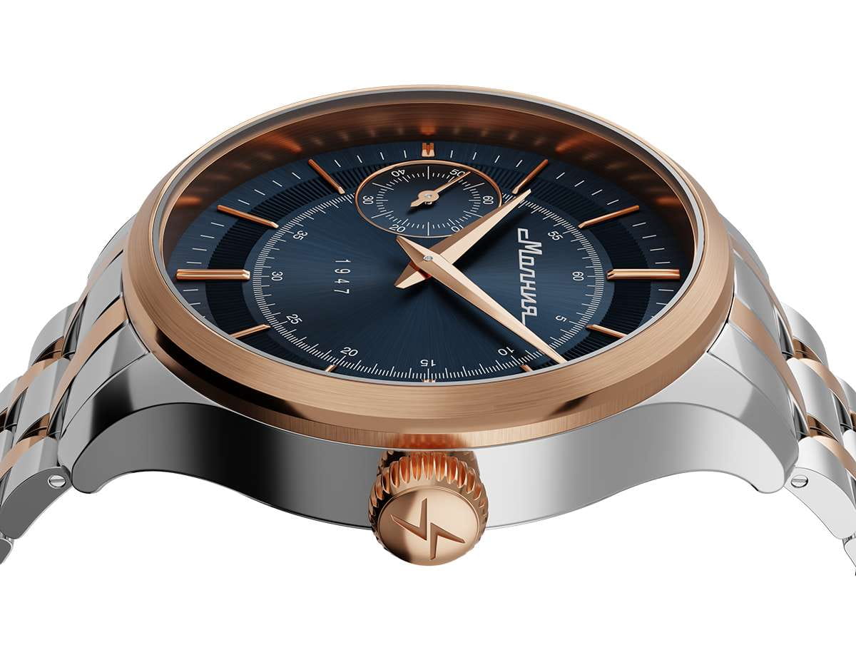 Мужские механические часы с ручным подзаводом — это аксессуар от легендарного бренда «МОЛНИЯ», созданный на Челябинском часовом заводе. Корпус диаметром 41 мм выполнен из нержавеющей стали 316L. БезельБезельВнешний ободок, закрепляющий стекло. В спортивных часах так называется поворотное кольцо с делениями на циферблате, выполняет роль таймера – замеряет отрезки времени на шкале. Неподвижный безель – элемент декора. Однонаправленно вращающийся безель на дайверских часах позволяет фиксировать моменты погружения и выныривания на поверхность. выполнен из стали с PVD-покрытиемPVDУльтратонкое покрытие наносится в технике вакуумного напыления, сочетает в себе нитрид титана особой прочности со слоем золота или оксида хрома. Несёт в себе декоративную или защитную функцию. и зеркальной отделкой. Циферблат синего цвета оформлен индексами и стрелками. Малая секундная стрелка вынесена на позицию 9 часов. Циферблат защищён сапфировым стекломСапфировое стеклоПрочный и надёжный материал из кристалла сапфира синтетического происхождения, характеризующийся особой твёрдостью и устойчивостью к царапинам и повреждениям. толщиной 2 мм. Механизм — мануфактурный калибр 3603, собранный вручную, с запасом хода до 40 часов. Прозрачная задняя крышка позволяет наблюдать за работой механизма. Часы оснащены стальным браслетом с частичным PVD-покрытиемPVDУльтратонкое покрытие наносится в технике вакуумного напыления, сочетает в себе нитрид титана особой прочности со слоем золота или оксида хрома. Несёт в себе декоративную или защитную функцию. под золото и системой быстрой замены на раскладной застёжкеРаскладная застёжкаТакой тип застёжки используется только на браслетах из металла. Она никогда не раскрывается полностью, происходит разделение на 2 и более частей. Раскладывающая застёжка снизит вероятность потери часов к минимуму. типа клипса. Водонепроницаемость 50 м позволяет использовать часы в повседневных условиях. Идеальный выбор для тех, кто ценит российское качество и традиции.
