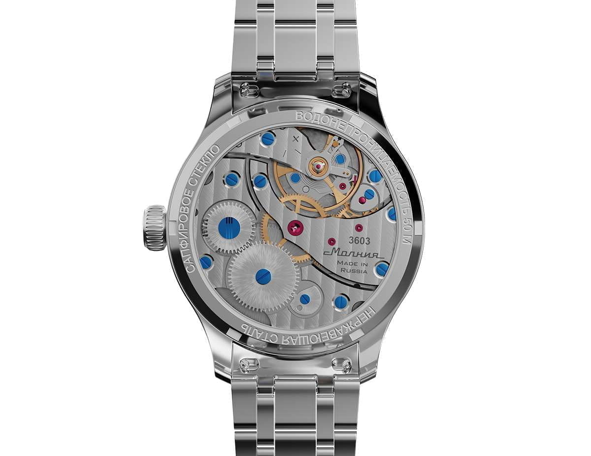 Мужские механические часы с ручным подзаводом — это аксессуар от легендарного бренда «МОЛНИЯ», созданный на Челябинском часовом заводе. Корпус диаметром 41 мм выполнен из нержавеющей стали 316L с зеркальной полировкой. БезельБезельВнешний ободок, закрепляющий стекло. В спортивных часах так называется поворотное кольцо с делениями на циферблате, выполняет роль таймера – замеряет отрезки времени на шкале. Неподвижный безель – элемент декора. Однонаправленно вращающийся безель на дайверских часах позволяет фиксировать моменты погружения и выныривания на поверхность. также выполнен из стали с зеркальной отделкой. Циферблат зелёного цвета оформлен индексами и стрелками. Малая секундная стрелка вынесена на позицию 9 часов. Циферблат защищён сапфировым стекломСапфировое стеклоПрочный и надёжный материал из кристалла сапфира синтетического происхождения, характеризующийся особой твёрдостью и устойчивостью к царапинам и повреждениям. толщиной 2 мм. Механизм — мануфактурный калибр 3603, собранный вручную, с запасом хода до 40 часов. Прозрачная задняя крышка позволяет наблюдать за работой механизма. Часы оснащены стальным браслетом с раскладной застёжкойРаскладная застёжкаТакой тип застёжки используется только на браслетах из металла. Она никогда не раскрывается полностью, происходит разделение на 2 и более частей. Раскладывающая застёжка снизит вероятность потери часов к минимуму. с кнопочным открытием и системой быстрой замены. Водонепроницаемость 50 м позволяет использовать часы в повседневных условиях. Идеальный выбор для тех, кто ценит российское качество и традиции.