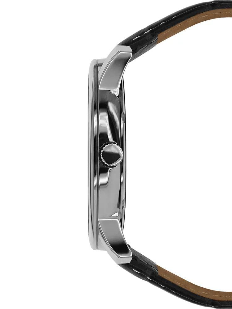 Ремешок выполнен из натуральной кожи чёрного цвета, обеспечивая комфорт при носке. Толщина корпуса составляет 12 мм, что придаёт часам солидный вид.
