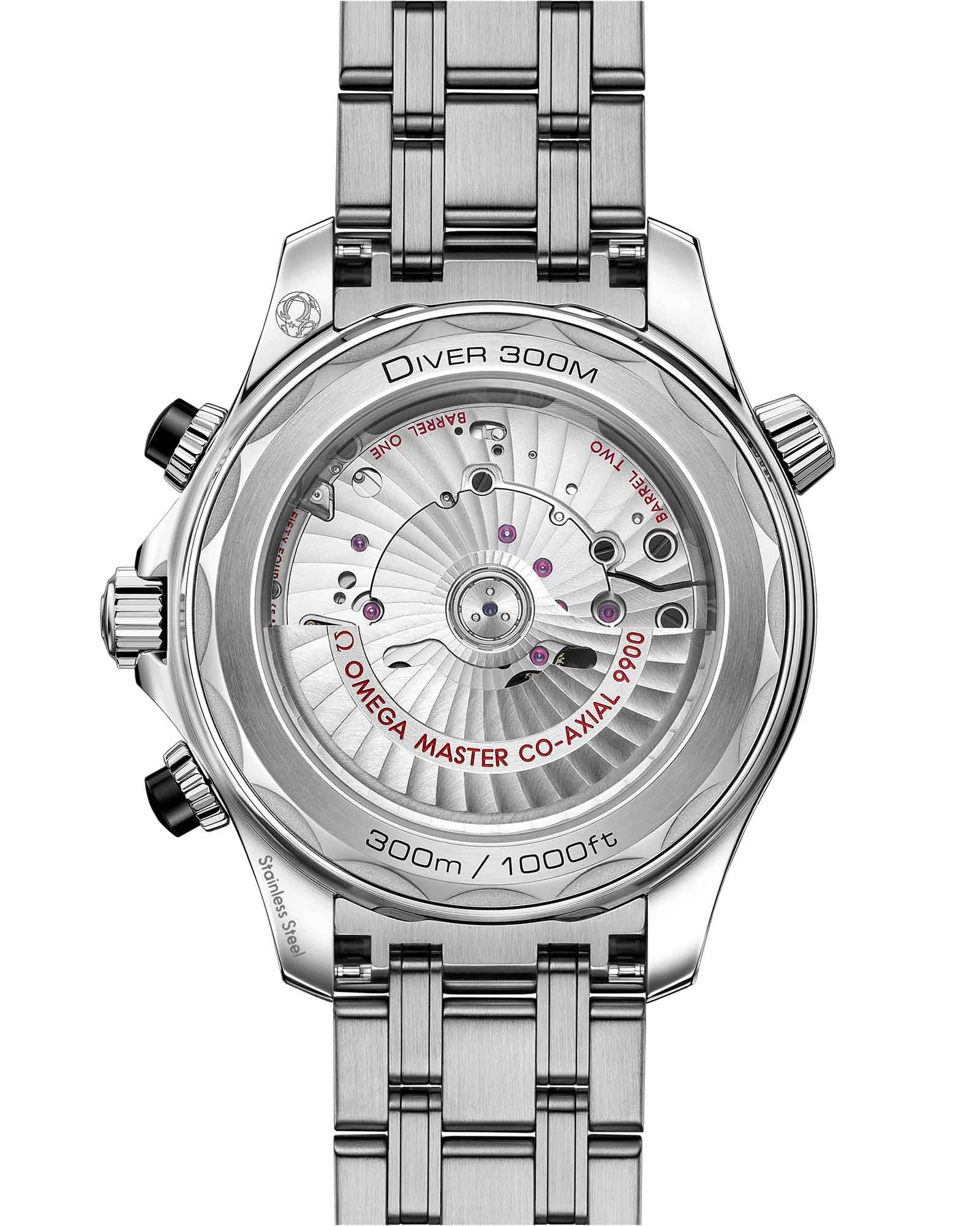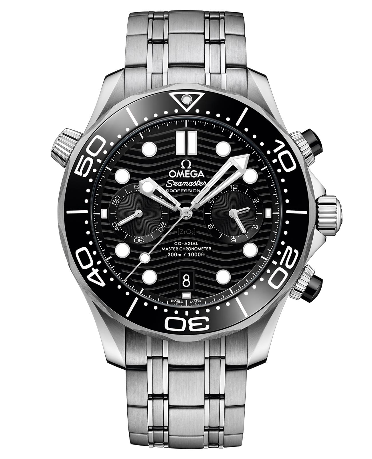 Рожденные в 1993 году, часы Seamaster Professional Diver 300M мгновенно покорили сердца истинных ценителей часового искусства, а сегодняшняя коллекция воплощает легендарное океанское наследие, обогащенное передовыми инновациями и фирменными дизайнерскими решениями OMEGA. Этот хронографХронографФункция позволяет измерять отрезки времени с особой точностью: часы, минуты, секунды. Верным признаком хронографа является наличие на циферблате 3 дополнительных окошек-счётчиков. с впечатляющими 44 мм демонстрирует корпус из нержавеющей стали, дополненный полированным черным керамическим безелемБезельВнешний ободок, закрепляющий стекло. В спортивных часах так называется поворотное кольцо с делениями на циферблате, выполняет роль таймера – замеряет отрезки времени на шкале. Неподвижный безель – элемент декора. Однонаправленно вращающийся безель на дайверских часах позволяет фиксировать моменты погружения и выныривания на поверхность. с профессиональной дайверской шкалой, где керамические кнопки и циферблат украшены лазерной гравировкой с волнообразным узором, а на позиции "6 часов" гармонично интегрировано окошко индикатора даты. Стрелки счетчиков сияют благородным родиевым покрытием, тогда как основные стрелки и индексы с люминесцентным составом Super-LumiNovaЛюминесцентное покрытиеПозволяет считывать показания времени в темноте. Производители наносят на стрелки, часовые индексы, безель или поверхность циферблата светонакопительный состав, дающий холодное свечение. гарантируют безупречную видимость в экстремальных условиях. Завершает образ элегантный браслет из нержавеющей стали, подчеркивающий статус модели, а через сапфировое стеклоСапфировое стеклоПрочный и надёжный материал из кристалла сапфира синтетического происхождения, характеризующийся особой твёрдостью и устойчивостью к царапинам и повреждениям. задней крышки с волнообразным профилем открывается вид на высокоточный механизм OMEGA Master Chronometer 9900 - подлинный шедевр часового искусства.