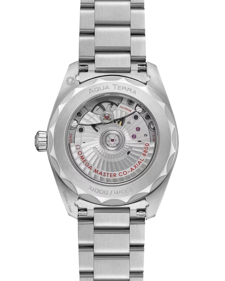 Omega Seamaster Aqua Terra выполнены в симметричном корпусе из нержавеющей стали с завинчивающейся задней крышкой, украшенной волновым узором. Циферблат дополнен окошком даты на 6 часах и оформлен горизонтальным рисунком, вдохновлённым текстурой тикового дерева палуб яхт. Стрелки и метки оснащены люминесцентным покрытиемЛюминесцентное покрытиеПозволяет считывать показания времени в темноте. Производители наносят на стрелки, часовые индексы, безель или поверхность циферблата светонакопительный состав, дающий холодное свечение. Super-LumiNova для лучшей читаемости в темноте. Калибр Omega 8800 сертифицирован как Master Chronometer — гарантия высочайшей точности и устойчивости к магнитным полям. Запас хода составляет 55 часов. Защиту циферблата обеспечивает сапфировое стеклоСапфировое стеклоПрочный и надёжный материал из кристалла сапфира синтетического происхождения, характеризующийся особой твёрдостью и устойчивостью к царапинам и повреждениям. с антибликовым покрытиемАнтибликовое покрытиеСлой оксида металла в 0,13-0,3 микрон, благодаря которому стекло часов не бликует и не отражает свет. Антибликовое покрытие уменьшает отражение света в 10 раз, обеспечивая отличную читаемость показателей циферблата. с обеих сторон. Водозащита позволяет использовать часы в воде без риска повреждения. Часы установлены на полированный и матовый браслет. Это сочетание премиального качества, технологичности и классического дизайна.