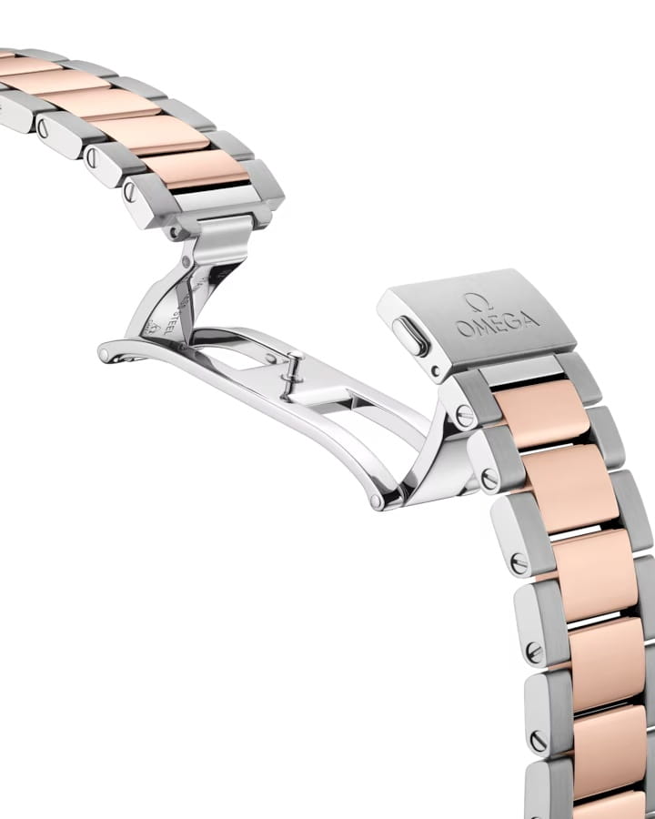 Omega Seamaster Aqua Terra выполнены в симметричном корпусе из нержавеющей стали и 18K Sedna™ золота с завинчивающейся задней крышкой, украшенной волновым узором. Циферблат украшен гильошированием "морские волны" и дополнен окошком даты на 6 часах. Стрелки и метки оснащены люминесцентным покрытиемЛюминесцентное покрытиеПозволяет считывать показания времени в темноте. Производители наносят на стрелки, часовые индексы, безель или поверхность циферблата светонакопительный состав, дающий холодное свечение. Super-LumiNova для лучшей читаемости в темноте. Калибр Omega 8800 сертифицирован как Master Chronometer — гарантия высочайшей точности и устойчивости к магнитным полям. Запас хода составляет 55 часов. Защиту циферблата обеспечивает сапфировое стеклоСапфировое стеклоПрочный и надёжный материал из кристалла сапфира синтетического происхождения, характеризующийся особой твёрдостью и устойчивостью к царапинам и повреждениям. с антибликовым покрытиемАнтибликовое покрытиеСлой оксида металла в 0,13-0,3 микрон, благодаря которому стекло часов не бликует и не отражает свет. Антибликовое покрытие уменьшает отражение света в 10 раз, обеспечивая отличную читаемость показателей циферблата.. Водозащита позволяет использовать часы в воде без риска повреждения. Часы установлены на комбинированный браслет из 18K Sedna™ золота и нержавеющей стали с застёжка «бабочка» с кнопкамиЗастёжка "бабочка"Такой вид застёжки дополняется предохранителями, помогающими избежать случайного раскрытия браслета. Обладают изящным исполнением. . Это сочетание премиального качества, технологичности и классического дизайна.
