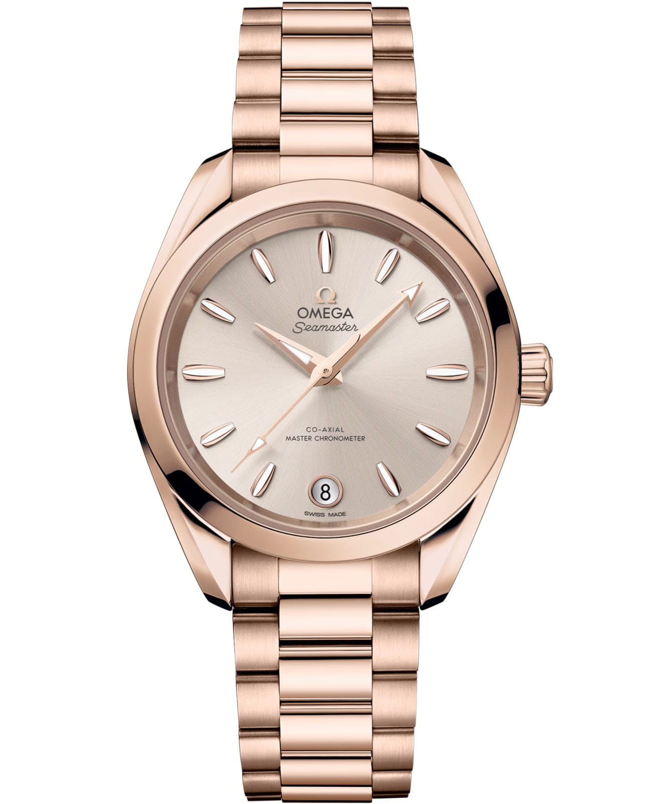 Часы Omega Seamaster Aqua Terra выполнены в симметричном корпусе из полированного 18K Sedna™ золота с завинчивающейся задней крышкой, украшенной волновым узором. Модель дополнена конической заводной головкой и окошком даты на 6 часах, окаймлённым кольцом из 18K Sedna™ золота. Циферблат выполнен по технологии linen и покрыт слоем PVD для повышения стойкости цвета. Он оформлен с использованием люминесцентного покрытияЛюминесцентное покрытиеПозволяет считывать показания времени в темноте. Производители наносят на стрелки, часовые индексы, безель или поверхность циферблата светонакопительный состав, дающий холодное свечение. Super-LumiNova, что обеспечивает отличную читаемость в темноте. Стрелки и индексы в форме корпусов парусников подчёркивают морское наследие коллекции. Калибр Omega 8801 сертифицирован как Master Chronometer — гарантия высочайшей точности и устойчивости к магнитным полям. Запас хода составляет 55 часов. Защиту циферблата обеспечивает сапфировое стеклоСапфировое стеклоПрочный и надёжный материал из кристалла сапфира синтетического происхождения, характеризующийся особой твёрдостью и устойчивостью к царапинам и повреждениям. с антибликовым покрытиемАнтибликовое покрытиеСлой оксида металла в 0,13-0,3 микрон, благодаря которому стекло часов не бликует и не отражает свет. Антибликовое покрытие уменьшает отражение света в 10 раз, обеспечивая отличную читаемость показателей циферблата. с обеих сторон. Водозащита позволяет использовать часы в воде без риска повреждения. Часы установлены на браслет из 18K Sedna™ золота с раскладной застёжкойРаскладная застёжкаТакой тип застёжки используется только на браслетах из металла. Она никогда не раскрывается полностью, происходит разделение на 2 и более частей. Раскладывающая застёжка снизит вероятность потери часов к минимуму.. Это сочетание премиального качества, технологичности и классического дизайна.