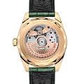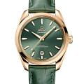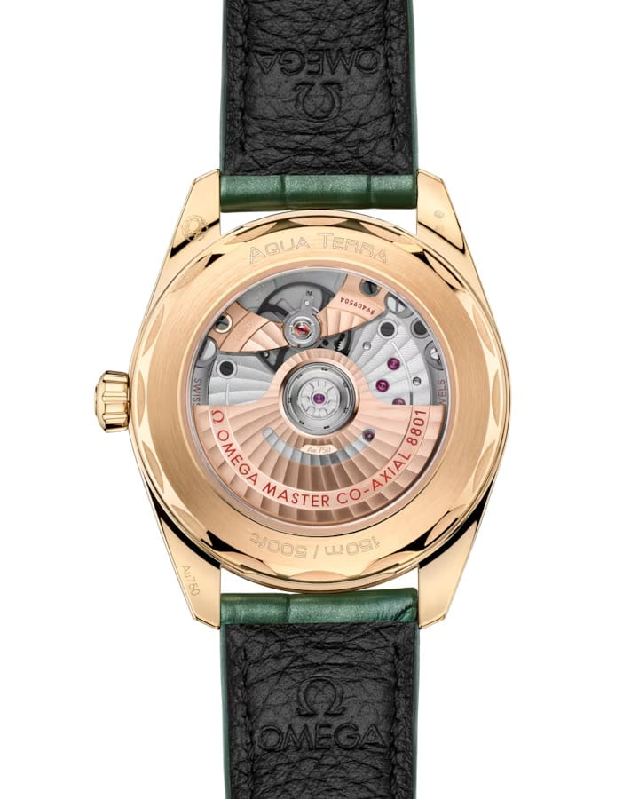 Omega Seamaster Aqua Terra выполнены в симметричном корпусе из полированного 18K Moonshine™ золота с завинчивающейся задней крышкой, украшенной волновым узором. Циферблат дополнен окошком даты на 6 часах, окаймлённым кольцом из 18K Moonshine™ золота. Стрелки и метки выполнены из 18K Moonshine™ золота и оснащены люминесцентным покрытиемЛюминесцентное покрытиеПозволяет считывать показания времени в темноте. Производители наносят на стрелки, часовые индексы, безель или поверхность циферблата светонакопительный состав, дающий холодное свечение. Super-LumiNova для лучшей читаемости в темноте. Индексы выполнены в форме корпусов парусников — деталь, подчёркивающая морское наследие коллекции. Калибр Omega 8801 сертифицирован как Master Chronometer — гарантия высочайшей точности и устойчивости к магнитным полям. Запас хода составляет 55 часов. Защиту циферблата обеспечивает сапфировое стеклоСапфировое стеклоПрочный и надёжный материал из кристалла сапфира синтетического происхождения, характеризующийся особой твёрдостью и устойчивостью к царапинам и повреждениям. с антибликовым покрытиемАнтибликовое покрытиеСлой оксида металла в 0,13-0,3 микрон, благодаря которому стекло часов не бликует и не отражает свет. Антибликовое покрытие уменьшает отражение света в 10 раз, обеспечивая отличную читаемость показателей циферблата. с обеих сторон. Водозащита позволяет использовать часы в воде без риска повреждения. Часы установлены на кожаный ремешок изумрудного цвета. Это сочетание премиального качества, технологичности и классического дизайна.