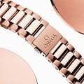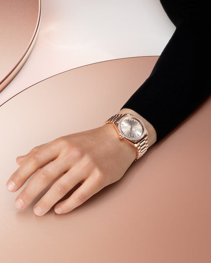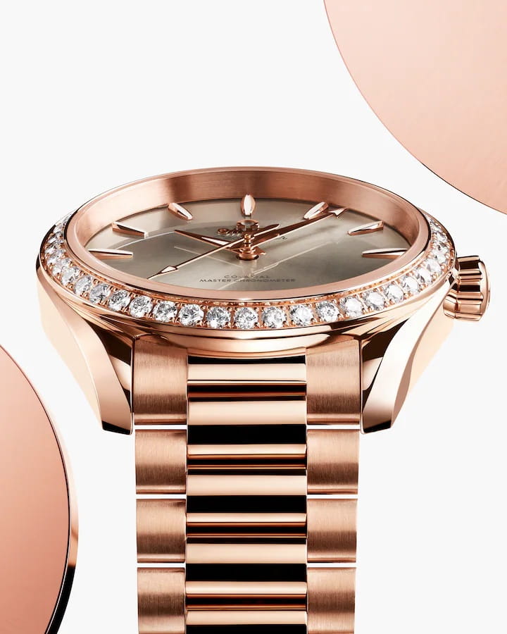 Omega Seamaster Aqua Terra выполнены в симметричном корпусе из полированного 18K Sedna™ золота с завинчивающейся задней крышкой, украшенной волновым узором. Безель инкрустирован бриллиантами, что добавляет модели роскошный акцент. Циферблат дополнен окошком даты на 6 часах, окаймлённым кольцом из 18K Sedna™ золота. Поверхность циферблата обработана методом CVD и имеет песочный оттенок с серыми вставками. Стрелки и метки выполнены из 18K Sedna™ золота и оснащены люминесцентным покрытиемЛюминесцентное покрытиеПозволяет считывать показания времени в темноте. Производители наносят на стрелки, часовые индексы, безель или поверхность циферблата светонакопительный состав, дающий холодное свечение. Super-LumiNova для лучшей читаемости в темноте. Индексы выполнены в форме корпусов парусников — деталь, подчёркивающая морское наследие коллекции. Калибр Omega 8801 сертифицирован как Master Chronometer — гарантия высочайшей точности и устойчивости к магнитным полям. Запас хода составляет 55 часов. Защиту циферблата обеспечивает сапфировое стеклоСапфировое стеклоПрочный и надёжный материал из кристалла сапфира синтетического происхождения, характеризующийся особой твёрдостью и устойчивостью к царапинам и повреждениям. с антибликовым покрытиемАнтибликовое покрытиеСлой оксида металла в 0,13-0,3 микрон, благодаря которому стекло часов не бликует и не отражает свет. Антибликовое покрытие уменьшает отражение света в 10 раз, обеспечивая отличную читаемость показателей циферблата. с обеих сторон. Водозащита позволяет использовать часы в воде без риска повреждения. Часы установлены на браслет из 18K Sedna™ золота с застёжкой-бабочкой с кнопкамиЗастёжка "бабочка"Такой вид застёжки дополняется предохранителями, помогающими избежать случайного раскрытия браслета. Обладают изящным исполнением. и закруглёнными звеньями. Это сочетание премиального качества, технологичности и классического дизайна.