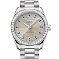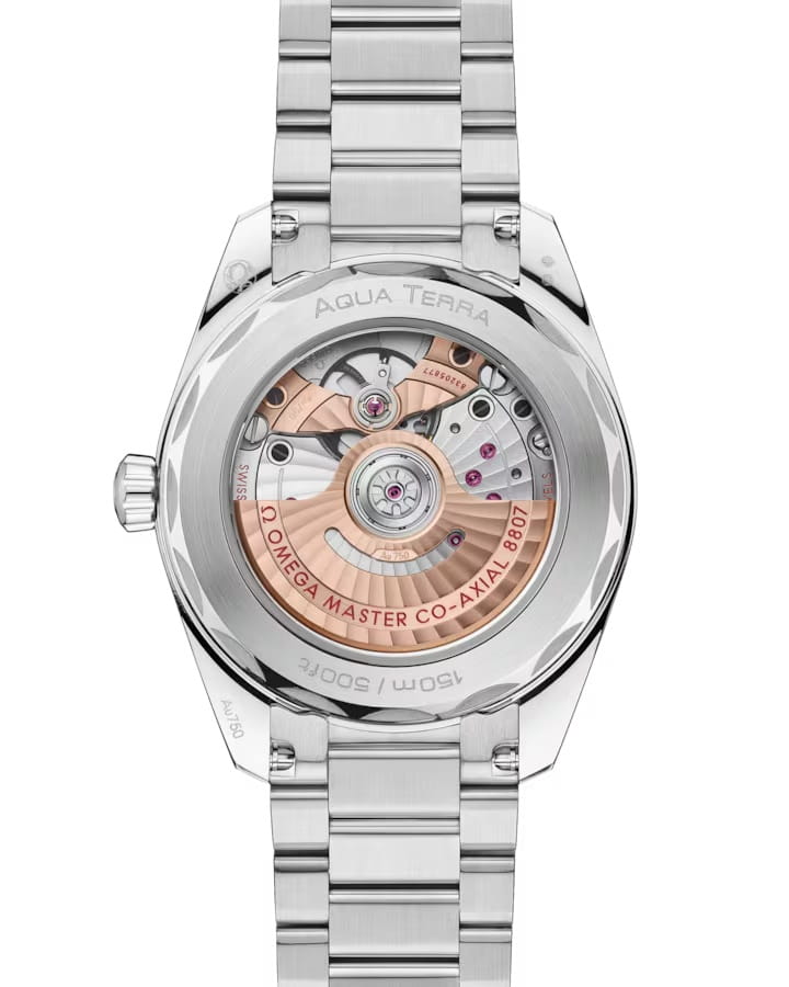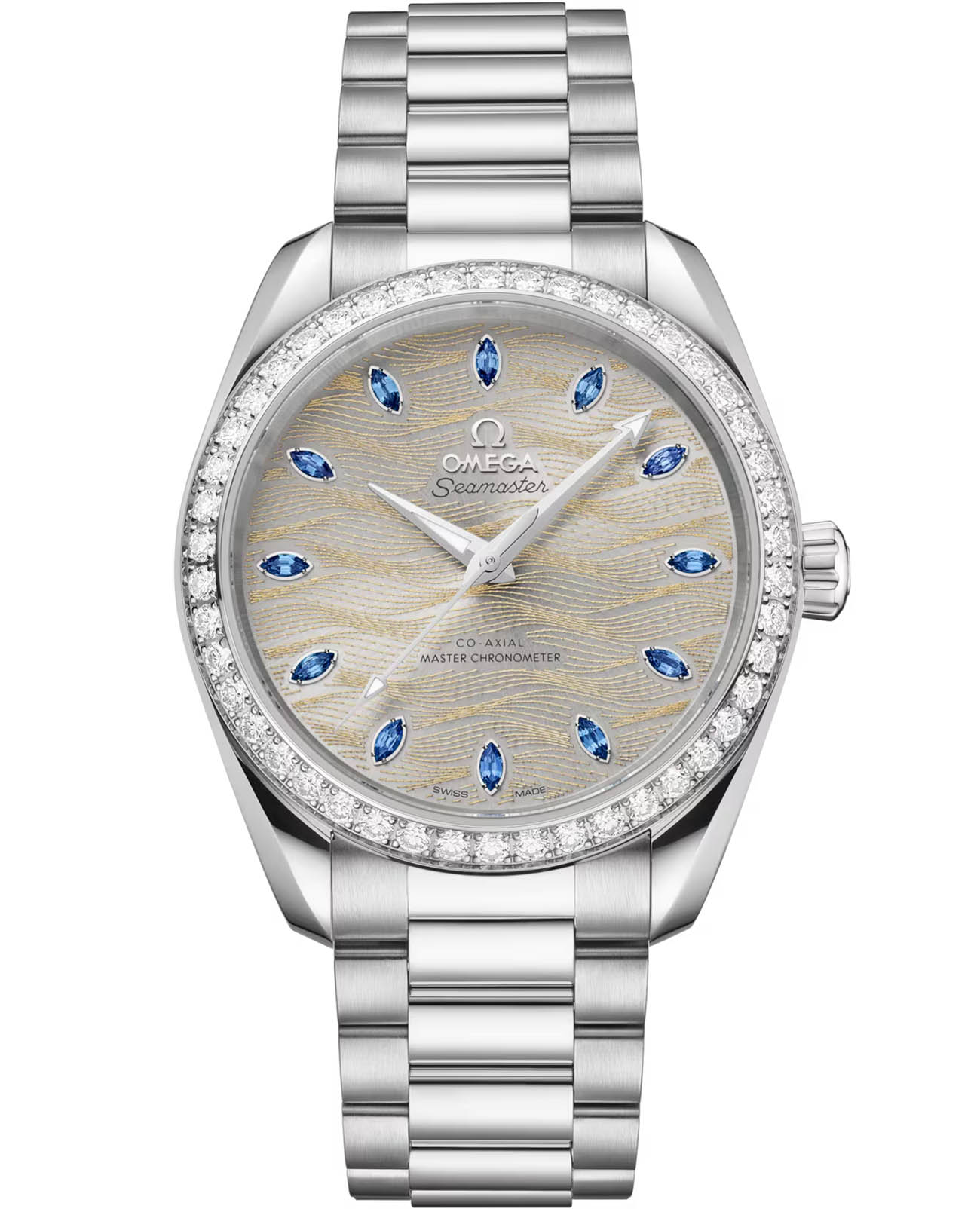 Omega Seamaster Aqua Terra выполнены в симметричном корпусе из полированного 18K Canopus™ золота с завинчивающейся задней крышкой, украшенной волновым узором. Безель инкрустирован бриллиантами, что придаёт модели особую роскошь и статусность. Циферблат дополнен окошком даты и оформлен уникальным волновым рисунком, созданным методом wire bonding — технологией, обеспечивающей высокую детализацию и объёмный эффект. Стрелки выполнены из белого 18К золота и оснащены люминесцентным покрытиемЛюминесцентное покрытиеПозволяет считывать показания времени в темноте. Производители наносят на стрелки, часовые индексы, безель или поверхность циферблата светонакопительный состав, дающий холодное свечение. Super-LumiNova для лучшей читаемости в темноте. Часовые метки выполнены из сапфировых кристаллов. Калибр Omega 8807 сертифицирован как Master Chronometer — гарантия высочайшей точности и устойчивости к магнитным полям. Запас хода составляет 55 часов. Защиту циферблата обеспечивает сапфировое стеклоСапфировое стеклоПрочный и надёжный материал из кристалла сапфира синтетического происхождения, характеризующийся особой твёрдостью и устойчивостью к царапинам и повреждениям. с антибликовым покрытиемАнтибликовое покрытиеСлой оксида металла в 0,13-0,3 микрон, благодаря которому стекло часов не бликует и не отражает свет. Антибликовое покрытие уменьшает отражение света в 10 раз, обеспечивая отличную читаемость показателей циферблата. с обеих сторон. Водозащита позволяет использовать часы в воде без риска повреждения. Часы установлены на браслет из 18K Canopus™ золота с новым дизайном звеньев. Это сочетание премиального качества, технологичности и классического дизайна.