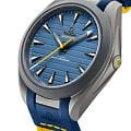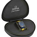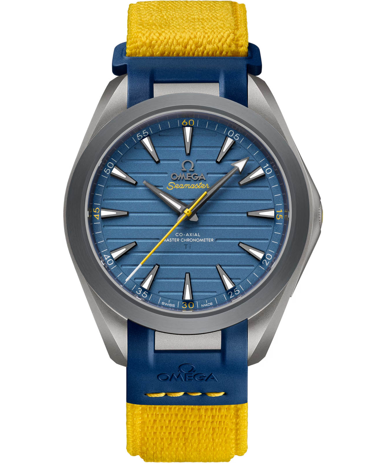 Часы Omega Seamaster Aqua Terra “Ultra Light” выполнены в корпусе из пескоструйного титана Grade 5 с завинчивающейся задней крышкой. Безель оснащён кольцом из керамики на основе нитрида кремния, устойчивой к царапинам и износу. Циферблат дополнен окошком даты и оформлен горизонтальным рисунком, выполненным методом лазерной гравировки. Секундная стрелка выделена жёлтым цветом и стилизована под шест для прыжков в высоту. Метки и стрелки оснащены люминесцентным покрытиемЛюминесцентное покрытиеПозволяет считывать показания времени в темноте. Производители наносят на стрелки, часовые индексы, безель или поверхность циферблата светонакопительный состав, дающий холодное свечение. Super-LumiNova для лучшей читаемости в темноте. Калибр Omega 8928 Ti создан специально для этой модели и отличается увеличенным запасом хода — до 72 часов. Механизм сертифицирован как Master Chronometer, что гарантирует высочайшую точность и устойчивость к магнитным полям. Защиту циферблата обеспечивает сапфировое стеклоСапфировое стеклоПрочный и надёжный материал из кристалла сапфира синтетического происхождения, характеризующийся особой твёрдостью и устойчивостью к царапинам и повреждениям. с антибликовым покрытиемАнтибликовое покрытиеСлой оксида металла в 0,13-0,3 микрон, благодаря которому стекло часов не бликует и не отражает свет. Антибликовое покрытие уменьшает отражение света в 10 раз, обеспечивая отличную читаемость показателей циферблата. с обеих сторон. Водозащита позволяет использовать часы в воде без риска повреждения. Часы установлены на интегрированный ремешок синего и жёлтого цветов из резины и нейлоновой ткани. Это сочетание сверхлёгкого исполнения, прочности и уникального дизайна, вдохновлённого спортивными достижениями.