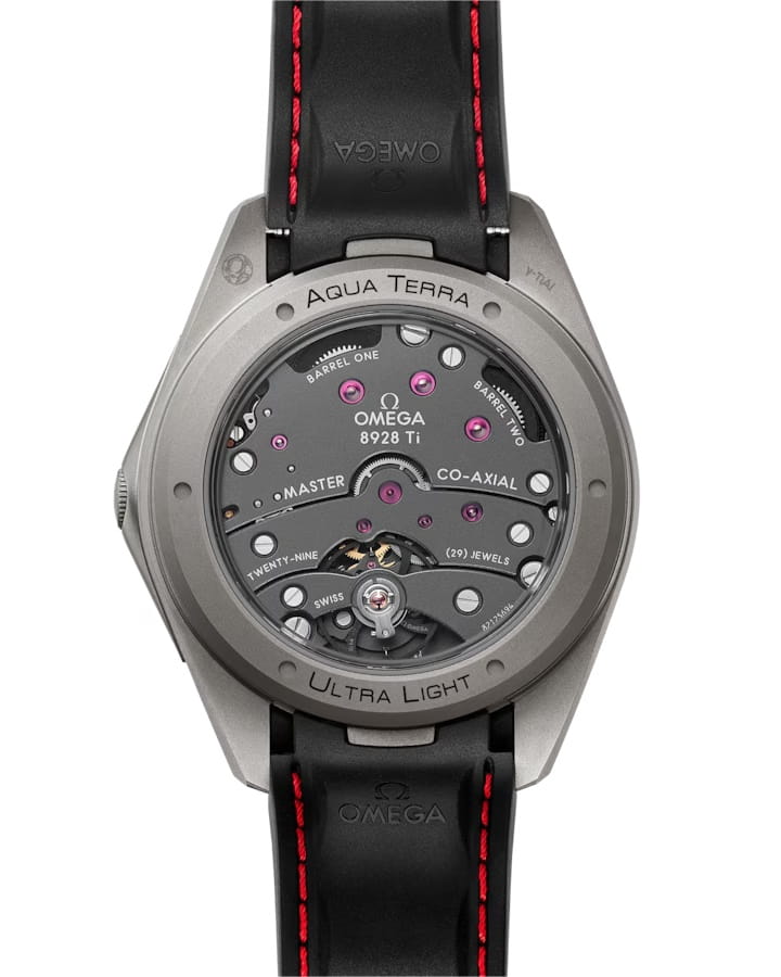 Omega Seamaster Aqua Terra выполнены в корпусе из авиационного титана Gamma Titanium, что делает их исключительно лёгкими. Модель оснащена завинчивающейся задней крышкой с прозрачным окном и винтовой заводной головкой с телескопической конструкцией для защиты от случайного открытия. Циферблат дополнен окошком даты и оформлен горизонтальным рисунком, вдохновлённым текстурой тикового дерева палуб яхт. Секундная стрелка выделена насыщенным красным цветом, а стрелки и метки оснащены люминесцентным покрытиемЛюминесцентное покрытиеПозволяет считывать показания времени в темноте. Производители наносят на стрелки, часовые индексы, безель или поверхность циферблата светонакопительный состав, дающий холодное свечение. Super-LumiNova для лучшей читаемости в темноте. Калибр Omega 8928 Ti — первый в истории Omega, выполненный полностью из титана. Он сертифицирован как Master Chronometer, что гарантирует высочайшую точность и устойчивость к магнитным полям. Запас хода составляет 72 часа. тЗащиту циферблата обеспечивает сапфировое стеклоСапфировое стеклоПрочный и надёжный материал из кристалла сапфира синтетического происхождения, характеризующийся особой твёрдостью и устойчивостью к царапинам и повреждениям. с антибликовым покрытиемАнтибликовое покрытиеСлой оксида металла в 0,13-0,3 микрон, благодаря которому стекло часов не бликует и не отражает свет. Антибликовое покрытие уменьшает отражение света в 10 раз, обеспечивая отличную читаемость показателей циферблата. с обеих сторон. Водозащита позволяет использовать часы в воде без риска повреждения. Часы установлены на черный каучуковый ремешок с контрастной красной строчкой. Это сочетание сверхлёгкого исполнения, прочности и уникального дизайна, созданного для спорта и повседневной носки.