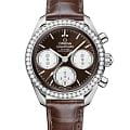 Speedmaster 38 мм — утончённая версия легендарного хронографа OMEGA, сочетающая классические черты с современной элегантностью. Полированный корпус из нержавеющей стали украшен безелемБезельВнешний ободок, закрепляющий стекло. В спортивных часах так называется поворотное кольцо с делениями на циферблате, выполняет роль таймера – замеряет отрезки времени на шкале. Неподвижный безель – элемент декора. Однонаправленно вращающийся безель на дайверских часах позволяет фиксировать моменты погружения и выныривания на поверхность. с 52 бриллиантами, а полированную заводную головку венчает ещё один сверкающий бриллиант. Коричневый циферблат с PVD-покрытиемPVDУльтратонкое покрытие наносится в технике вакуумного напыления, сочетает в себе нитрид титана особой прочности со слоем золота или оксида хрома. Несёт в себе декоративную или защитную функцию. эффектно дополнен горизонтальными овальными счётчиками с серебристой отделкой и вертикальным окошком даты на 6 часах. Часовые и минутные стрелки с родиевым покрытием и алмазной полировкой оснащены покрытием Super-LumiNovaЛюминесцентное покрытиеПозволяет считывать показания времени в темноте. Производители наносят на стрелки, часовые индексы, безель или поверхность циферблата светонакопительный состав, дающий холодное свечение., излучающим зелёное свечение. Часы дополнены коричневым кожаным ремешком с раскладывающейся застёжкойРаскладная застёжкаТакой тип застёжки используется только на браслетах из металла. Она никогда не раскрывается полностью, происходит разделение на 2 и более частей. Раскладывающая застёжка снизит вероятность потери часов к минимуму. из нержавеющей стали. На завинчивающейся задней крышке выгравирован фирменный медальон с морским коньком. В основе — высокоточный калибр OMEGA Co-Axial 3330, продолжающий традиции знаменитого хронографа.