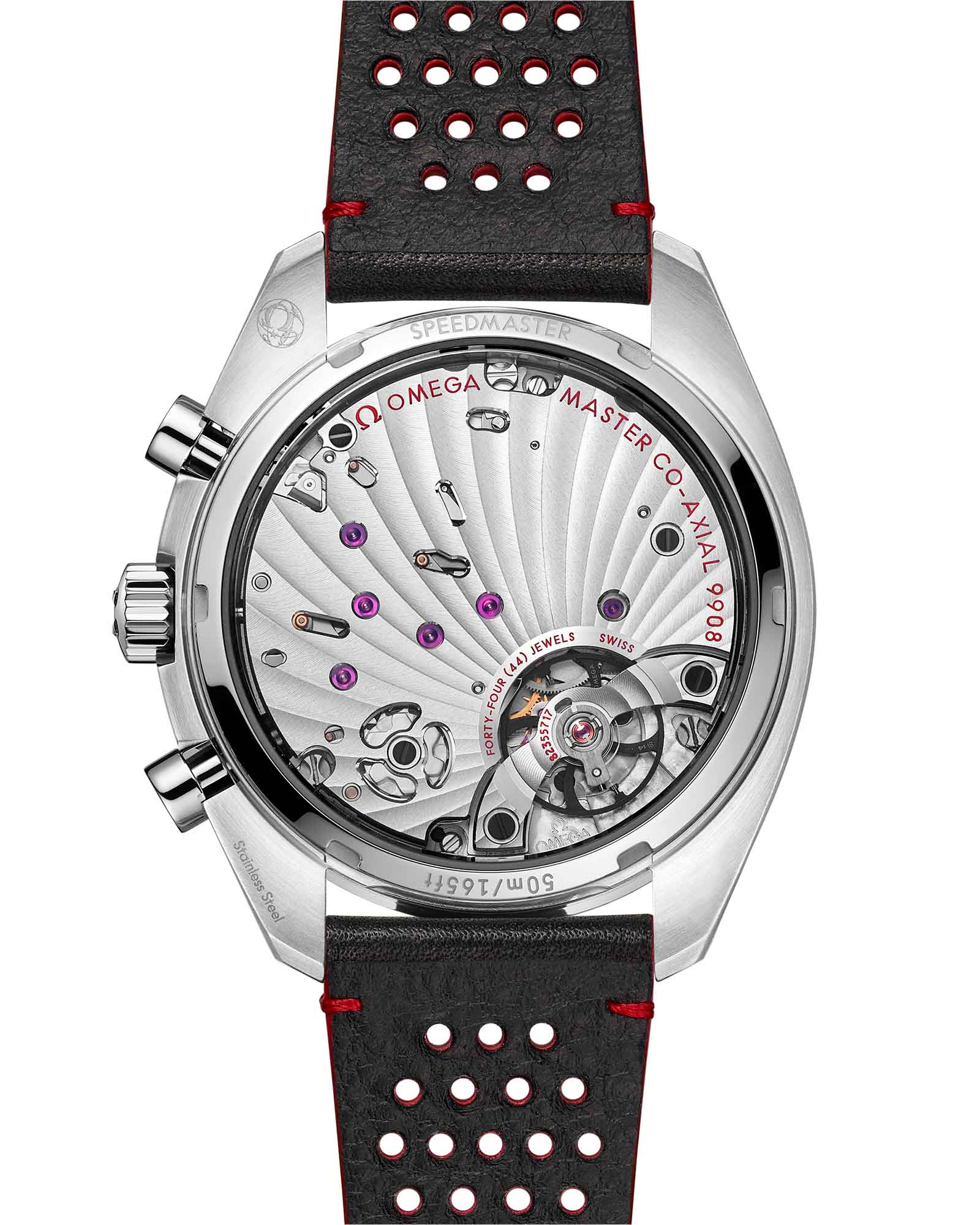 Chronoscope мастерски объединяет наследие винтажных хронографов OMEGA 1940-х с узнаваемой эстетикой Speedmaster. 43-мм корпус из нержавеющей стали с черным безелемБезельВнешний ободок, закрепляющий стекло. В спортивных часах так называется поворотное кольцо с делениями на циферблате, выполняет роль таймера – замеряет отрезки времени на шкале. Неподвижный безель – элемент декора. Однонаправленно вращающийся безель на дайверских часах позволяет фиксировать моменты погружения и выныривания на поверхность. из анодированного алюминия обрамляет серебристый циферблат, украшенный чернеными элементами и спиралевидным узором. Три исторические шкалы в форме улитки - тахиметрическаяТахиметрРазмеченная шкала, располагается на ободке или безеле часов. Тахиметр позволяет рассчитать скорость на определённом участке пути, расстояние измеряется в километрах или милях., пульсометрическая и телеметрическая - создают уникальный измерительный комплекс. Черненые стрелки в форме листьев и арабские цифры подчеркивают ретро-стиль. На позиции "9 часов" расположен счетчик малых секунд, а на "3 часах" -  "60-минутный и 12-часовой счетчики" с контрастными красными стрелками. Часы дополнены черным перфорированным кожаным ремешком с эффектной красной подкладкой, а калибр OMEGA Co-Axial Master Chronometer 9908 гарантирует безупречную точность, соединяя традиции с современными технологиями.