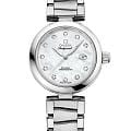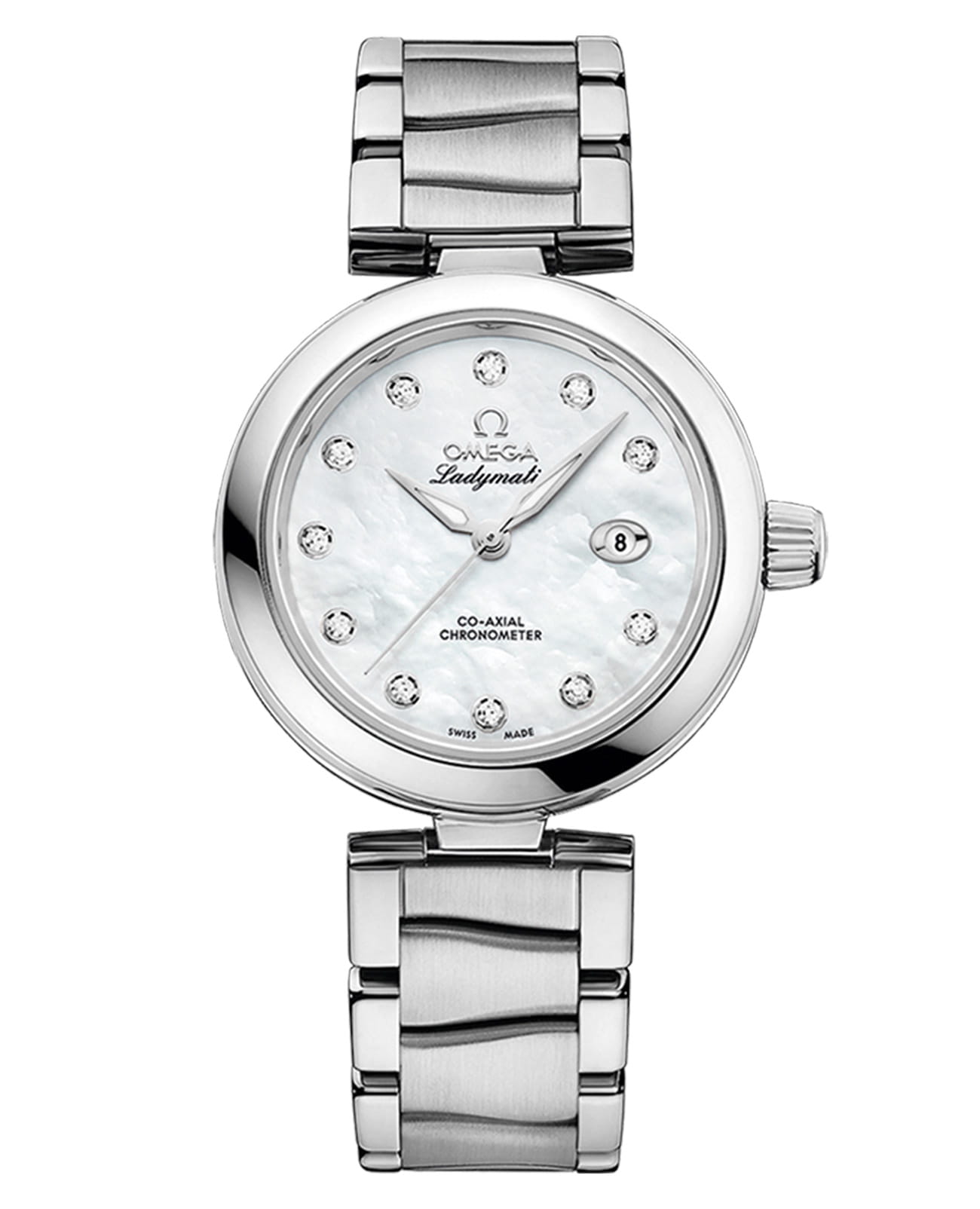 формы "альфа" и 11 бриллиантовых индексов. Циферблат из белого перламутра с жемчужным узором придает часам особое женственное очарование, а окошко даты на "3 часах" добавляет функциональности. Внутри бьется сердце настоящей леди — коаксиальный механизм OMEGA калибра 8520, сочетающий в себе многовековые традиции часового искусства с современными технологиями.