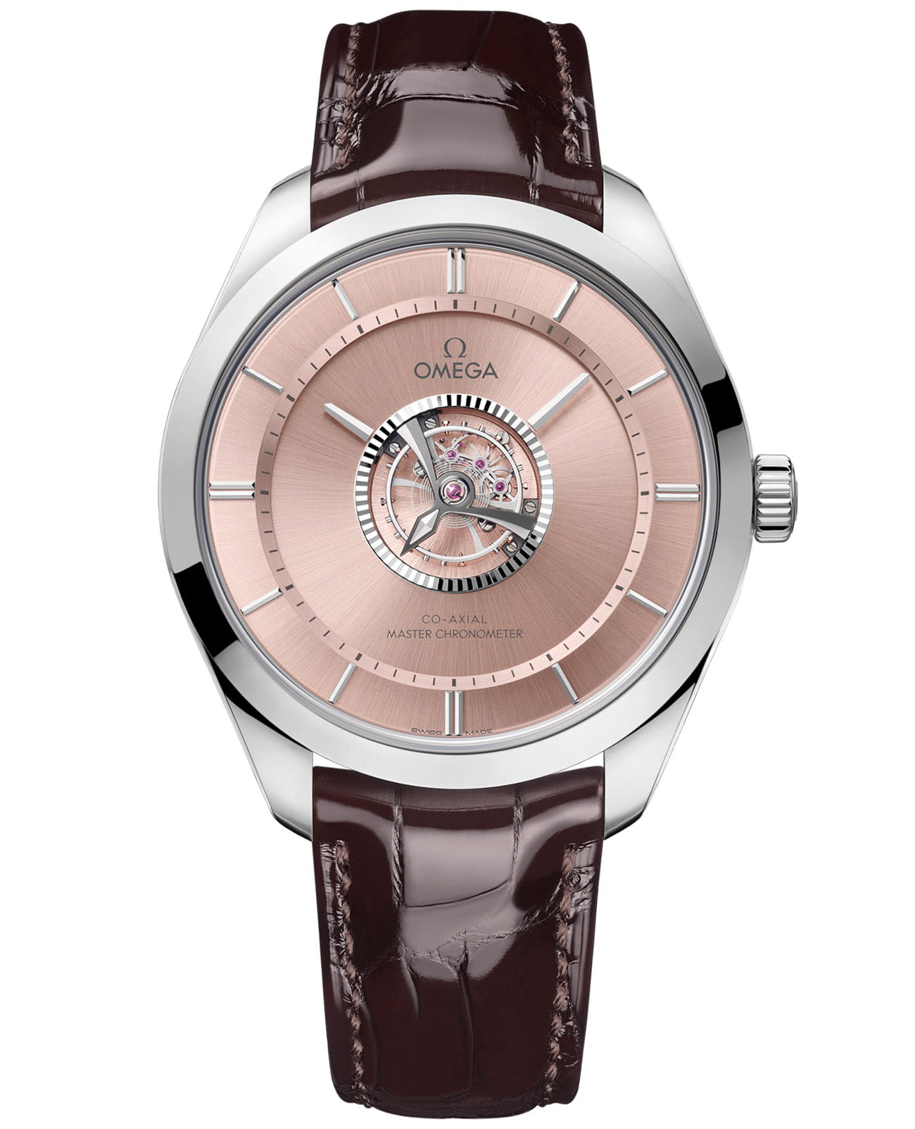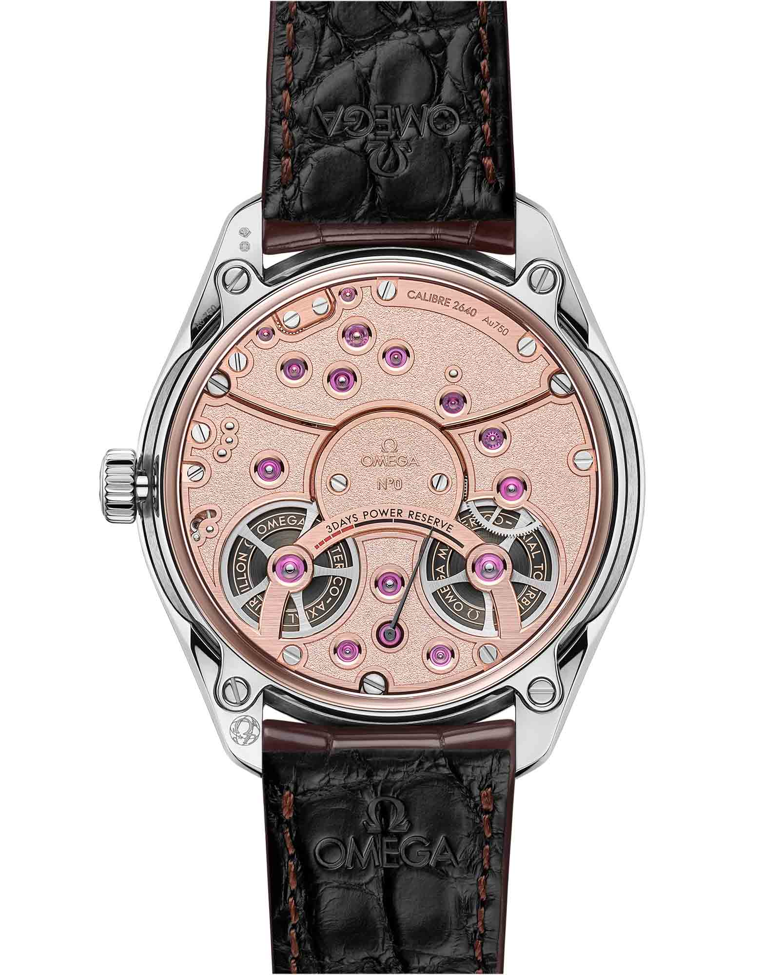 с радиальным сатинированием, логотипом и надписью темно-серого цвета. Циферблат состоит из центрального рифленого кольца, выполненного из 18-каратного золота Canopus Gold™, и внешних секций с часовыми/минутными стрелками и индексами из белого золота 18 карат, на которые нанесено PVD-покрытиеPVDУльтратонкое покрытие наносится в технике вакуумного напыления, сочетает в себе нитрид титана особой прочности со слоем золота или оксида хрома. Несёт в себе декоративную или защитную функцию. из золота Canopus Gold™. Для лучшей передачи эффекта титановый мост турбийона с отполированными вручную фасками украшен секундной стрелкой из 18-каратного золота Canopus Gold™ с алмазной полировкой. На задней крышке стрелка из 18-каратного золота Sedna™ с PVD-покрытием черного цвета указывает запас хода часов. Заводная головка, также выполненная из полированного 18-каратного золота Canopus Gold™, украшена символом Ω из 18-каратного золота Sedna™. Часы дополнены коричневым кожаным ремешком с полированной пряжкой из 18-каратного золота Canopus™. Задняя крышка из сапфирового стеклаСапфировое стеклоПрочный и надёжный материал из кристалла сапфира синтетического происхождения, характеризующийся особой твёрдостью и устойчивостью к царапинам и повреждениям. позволяет рассмотреть калибр OMEGA Co-Axial Master Chronometer 2640, выполненный из 18-каратного золота Sedna™. Каждый турбийон представлен в специальном футляре и дополнен сертификатом подлинности, дорожным чехлом и заводной головкой.