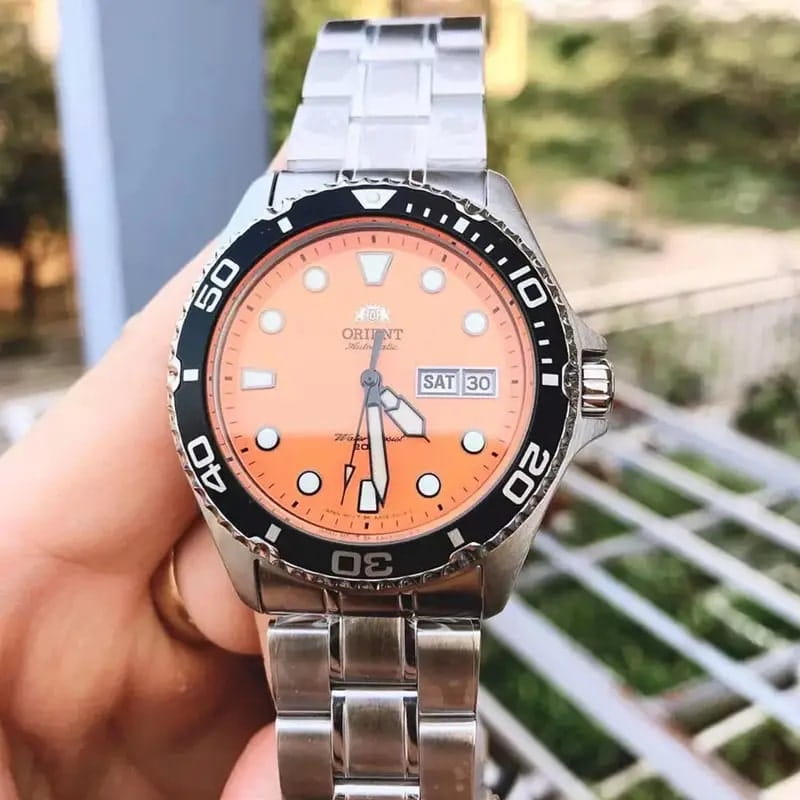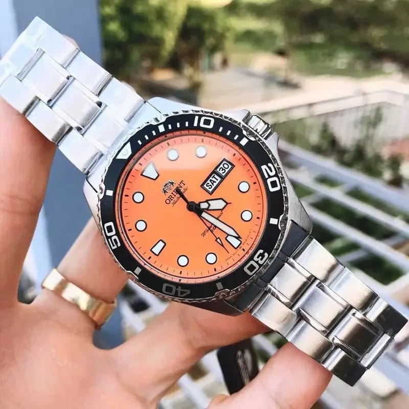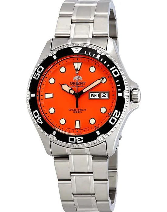 Мужские механические часы с автоподзаводом Orient Automatic AA02006M. Минеральное стеклоМинеральное стеклоМинеральное стекло представляет собой искусственно выращенный минерал кварца. Такое стекло отличается особой устойчивостью к повреждениям и царапинам. Уступает по некоторым качествам сапфировому стеклу. устойчивое к появлению царапин, обладающее высокой прозрачностью. Корпус из нержавеющей стали. Вращающийся безельБезельВнешний ободок, закрепляющий стекло. В спортивных часах так называется поворотное кольцо с делениями на циферблате, выполняет роль таймера – замеряет отрезки времени на шкале. Неподвижный безель – элемент декора. Однонаправленно вращающийся безель на дайверских часах позволяет фиксировать моменты погружения и выныривания на поверхность. из нержавеющей стали с PVDPVDУльтратонкое покрытие наносится в технике вакуумного напыления, сочетает в себе нитрид титана особой прочности со слоем золота или оксида хрома. Несёт в себе декоративную или защитную функцию. покрытием. Окошко даты в положении 3 часов. Стрелки с люминесцентным покрытиемЛюминесцентное покрытиеПозволяет считывать показания времени в темноте. Производители наносят на стрелки, часовые индексы, безель или поверхность циферблата светонакопительный состав, дающий холодное свечение.. Класс водозащиты: 200 метров, позволит плавать, нырять и заниматься другими водными видами спорта. Стальной браслет на раскладной застёжкеРаскладная застёжкаТакой тип застёжки используется только на браслетах из металла. Она никогда не раскрывается полностью, происходит разделение на 2 и более частей. Раскладывающая застёжка снизит вероятность потери часов к минимуму..