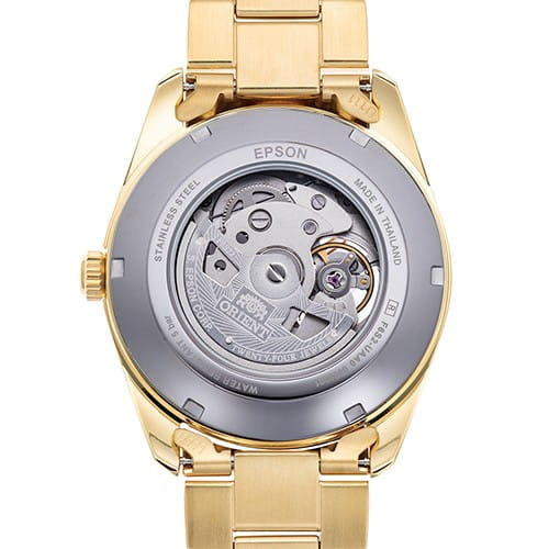 Корпус часов выполнен из нержавеющей стали с PVD-покрытиемPVDУльтратонкое покрытие наносится в технике вакуумного напыления, сочетает в себе нитрид титана особой прочности со слоем золота или оксида хрома. Несёт в себе декоративную или защитную функцию., что придаёт ему дополнительную износостойкость и элегантный внешний вид. Диаметр корпуса составляет 40,8 мм при толщине 10,9 мм. Водонепроницаемость модели достигает 50 метров, что защищает часы от случайных брызг или капель дождя. Часы оснащены сапфировым стекломСапфировое стеклоПрочный и надёжный материал из кристалла сапфира синтетического происхождения, характеризующийся особой твёрдостью и устойчивостью к царапинам и повреждениям., устойчивым к царапинам, и винтовой задней крышкой с прозрачным окном, позволяющим наблюдать за работой механизма.