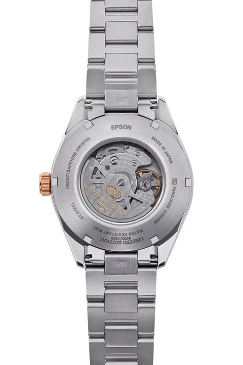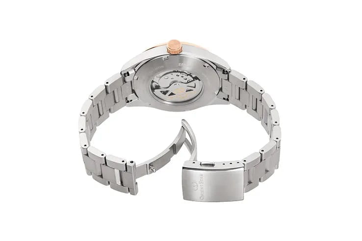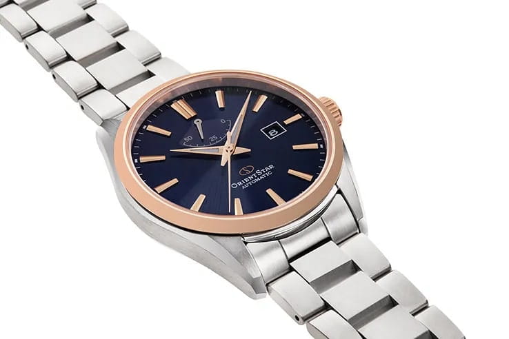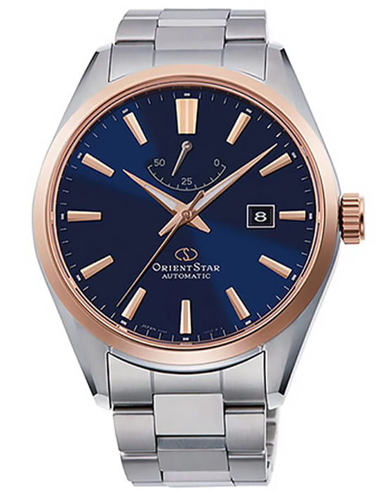 Часы Orient Star RE-AU0406L — это изысканное сочетание элегантного дизайна и передовых технологий. Корпус из нержавеющей стали диаметром 42 мм украшен элементами с PVD-покрытиемPVDУльтратонкое покрытие наносится в технике вакуумного напыления, сочетает в себе нитрид титана особой прочности со слоем золота или оксида хрома. Несёт в себе декоративную или защитную функцию. розового золота, что придаёт модели роскошный вид. Глубокий синий циферблат, символизирующий ночное небо, защищён Сапфировым стекломСапфировое стеклоПрочный и надёжный материал из кристалла сапфира синтетического происхождения, характеризующийся особой твёрдостью и устойчивостью к царапинам и повреждениям., обеспечивающим надёжную защиту от царапин. Автоматический механизм Orient Calibre F6N43 с 22 камнями и запасом хода до 50 часов гарантирует высокую точность. Индикатор запаса хода, расположенный на отметке «12 часов», и окошко даты на «3 часах» добавляют удобства в повседневной жизни. Браслет из нержавеющей стали оснащён раскладной застёжкой для комфорта и надёжности. Водонепроницаемость до 100 метров делает эту модель подходящей для плавания и активного использования. Orient Star RE-AU0406L00B — это часы для тех, кто ценит роскошь, функциональность и мастерство часового искусства.
