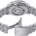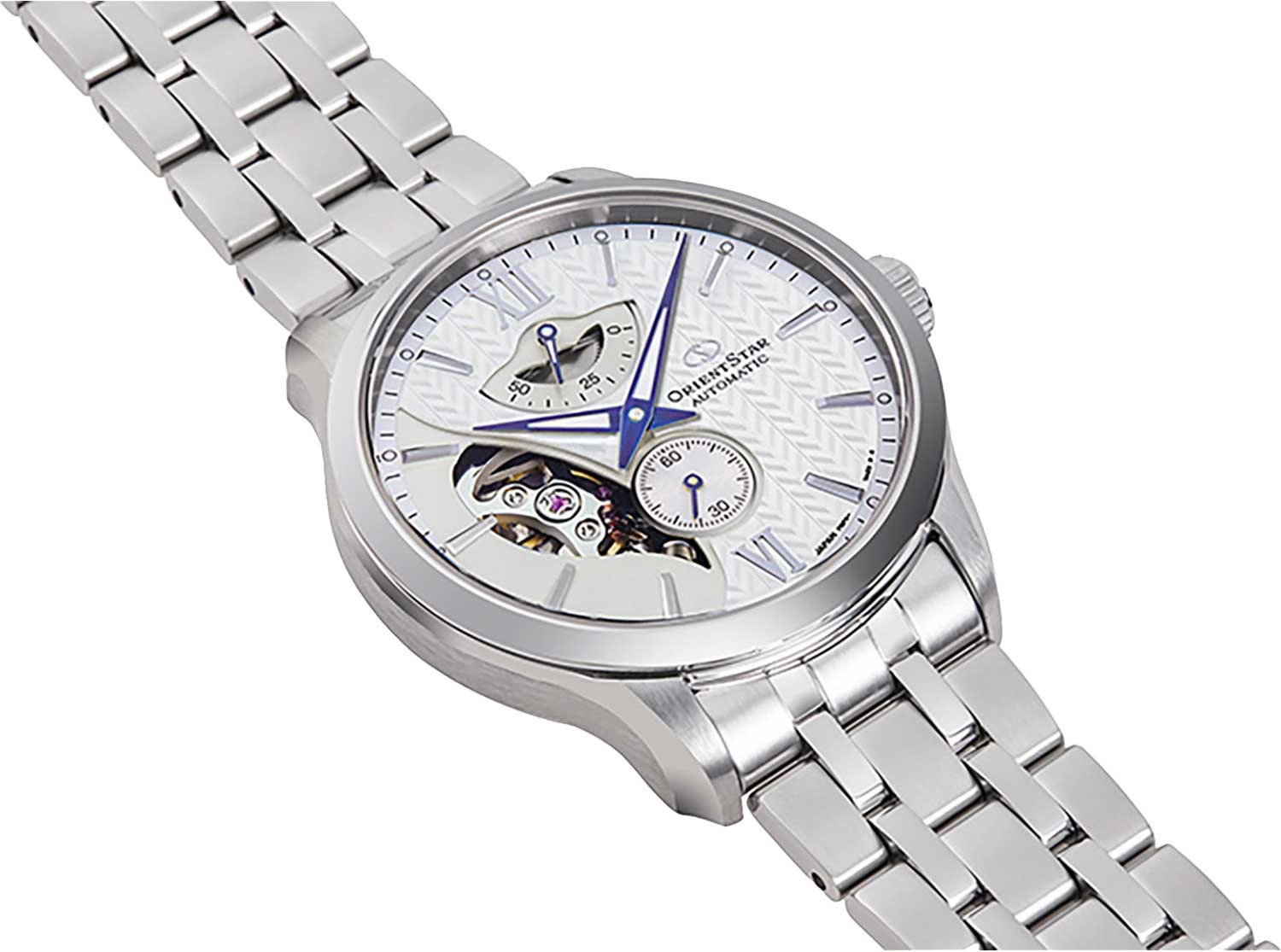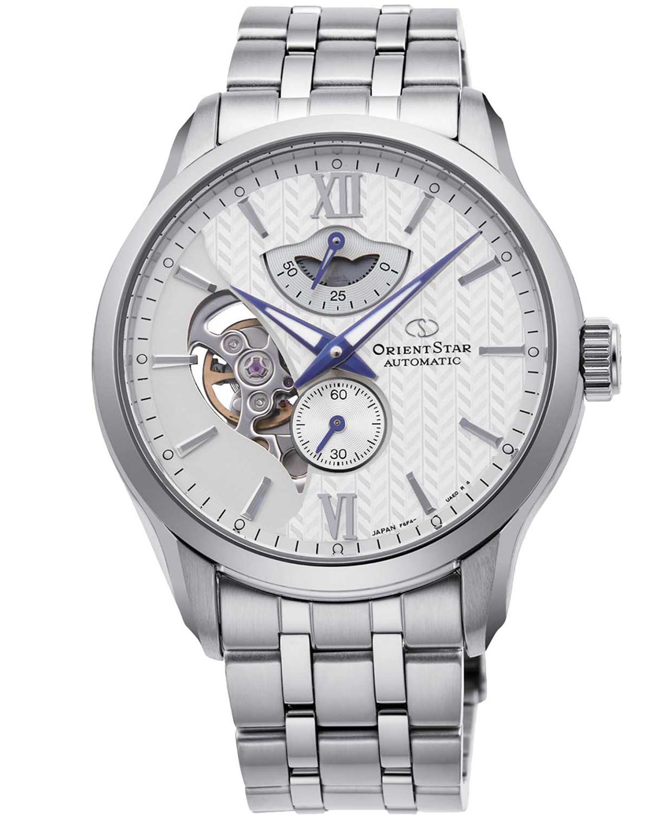 Часы Orient Star RK-AV0B01S — это мужская модель, которая сочетает в себе современный дизайн и передовые технологии. Корпус выполнен из нержавеющей стали, имеет круглую форму с диаметром 41 мм и толщиной 13,6 мм. Часы оснащены белым циферблатом с уникальным двухслойным дизайном, где верхний слой выполнен в виде узора «елочка», а нижний — с узором «пейсли», что создает эффект глубины и текстуры, напоминающей ткань костюма. Защита циферблата обеспечивается сапфировым стекломСапфировое стеклоПрочный и надёжный материал из кристалла сапфира синтетического происхождения, характеризующийся особой твёрдостью и устойчивостью к царапинам и повреждениям. с антибликовым покрытиемАнтибликовое покрытиеСлой оксида металла в 0,13-0,3 микрон, благодаря которому стекло часов не бликует и не отражает свет. Антибликовое покрытие уменьшает отражение света в 10 раз, обеспечивая отличную читаемость показателей циферблата., что повышает читаемость и устойчивость к царапинам. Модель работает на автоматическом механизме Caliber F6F44, который поддерживает как автоподзавод, так и ручной завод. Точность хода составляет от +25 до -15 секунд в сутки, а запас хода достигает 50 часов. Это делает часы удобными для повседневного использования без необходимости частой подзарядки. Механизм также оснащен функцией остановки секундной стрелки, что позволяет точно выставлять время. Функционал часов включает индикатор запаса хода, расположенный на 12 часах, который отображает оставшийся запас энергии механизма. Это полезная функция для контроля состояния часов. На циферблате также расположено полупрозрачное окно в форме узора «пейсли», через которое частично видна работа механизма, что добавляет визуальной привлекательности. Стрелки и индексы покрыты люминесцентным напылениемЛюминесцентное покрытиеПозволяет считывать показания времени в темноте. Производители наносят на стрелки, часовые индексы, безель или поверхность циферблата светонакопительный состав, дающий холодное свечение., что обеспечивает хорошую видимость в условиях слабого освещения. Часы обладают водонепроницаемостью до 100 метров (10 бар), что делает их подходящими для плавания и других активных видов деятельности. Задняя крышка корпуса выполнена с прозрачным окном, что позволяет наблюдать за работой механизма. Браслет выполнен из нержавеющей стали и оснащен раскладной застежкойРаскладная застёжкаТакой тип застёжки используется только на браслетах из металла. Она никогда не раскрывается полностью, происходит разделение на 2 и более частей. Раскладывающая застёжка снизит вероятность потери часов к минимуму., которая обеспечивает удобство и надежность при ношении.