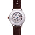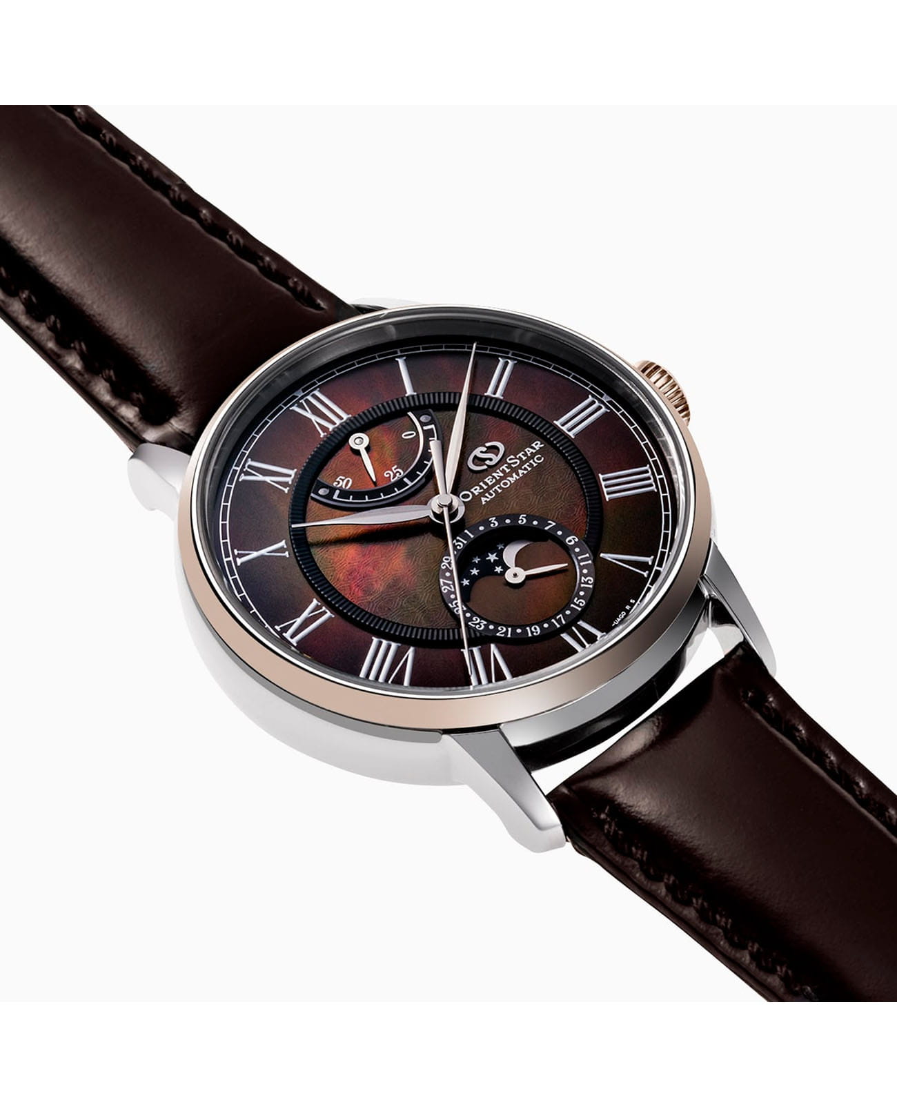 На циферблате расположен отдельный циферблат, отображающий число и фазы Луны, что добавляет часам элемент астрономической романтики. Часовые индексы выполнены в виде цифр, что придает часам строгий и лаконичный вид.