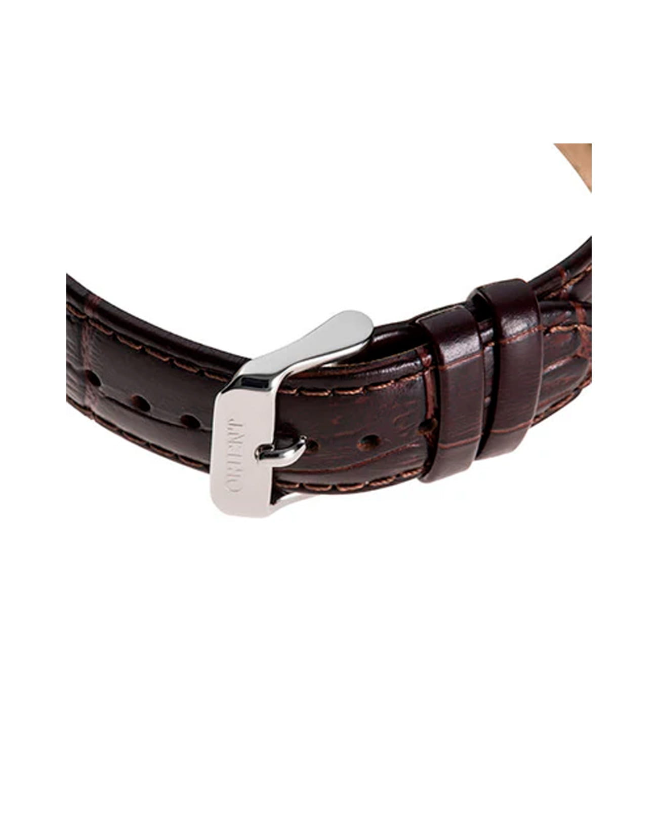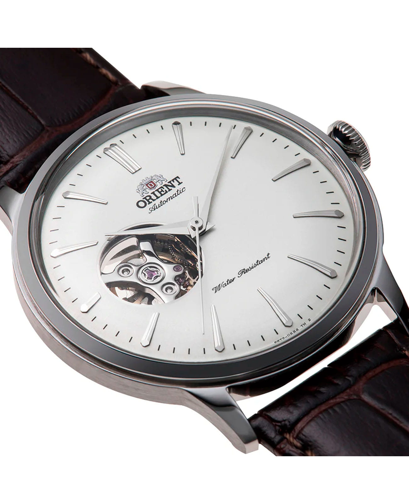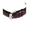 Циферблат выполнен в белом цвете с открытым сердечником (open heart) на позиции 9 часов, что добавляет часам уникальный и стильный вид. Браслет часов изготовлен из коричневой кожи, что придаёт часам классический и элегантный вид. Застёжка выполнена в виде традиционной конструкции, обеспечивающей надёжную фиксацию на запястье.