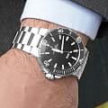 Корпус выполнен из прочной нержавеющей стали, что обеспечивает долговечность и устойчивость к внешним воздействиям. Поворотный безель помогает точно отслеживать время погружения, делая эти часы незаменимыми для дайверов. Циферблат черного цвета с метками в виде штрихов защищен сапфировым стекломСапфировое стеклоПрочный и надёжный материал из кристалла сапфира синтетического происхождения, характеризующийся особой твёрдостью и устойчивостью к царапинам и повреждениям., которое не царапается при механическом воздействии и является одним из лучших материалов для наручных часов.