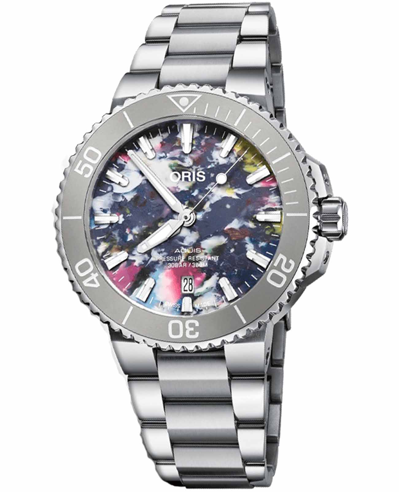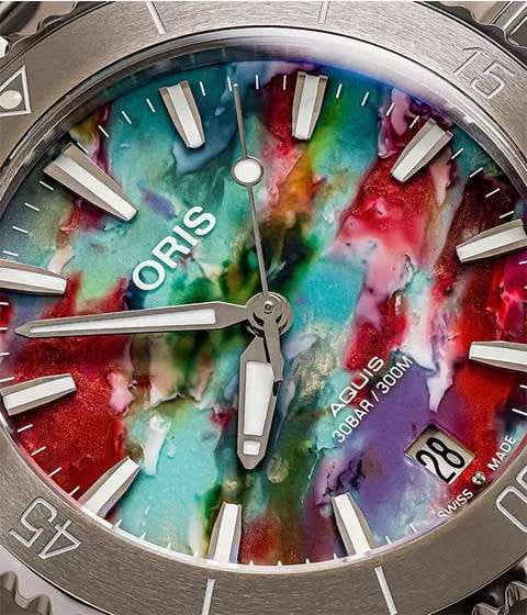 Oris 01 733 7766 4150-Set Aquis – это воплощение швейцарского часового мастерства, где традиции встречаются с инновациями. Эти механические наручные часы созданы для тех, кто ценит точность, надежность и безупречный стиль. Красочный циферблат часов Aquis Date Upcycle диаметром 41,5 мм изготовлен из переработанных пластиковых бутылок. Вращающийся керамический безельБезельВнешний ободок, закрепляющий стекло. В спортивных часах так называется поворотное кольцо с делениями на циферблате, выполняет роль таймера – замеряет отрезки времени на шкале. Неподвижный безель – элемент декора. Однонаправленно вращающийся безель на дайверских часах позволяет фиксировать моменты погружения и выныривания на поверхность.. Сапфировое стеклоСапфировое стеклоПрочный и надёжный материал из кристалла сапфира синтетического происхождения, характеризующийся особой твёрдостью и устойчивостью к царапинам и повреждениям. с антибликовым покрытием защищает циферблат от царапин и обеспечивает отличную читаемость при любом освещении. Окошко даты находится в положении 6 часов. Быстрая установка даты. Браслет из нержавеющей стали идеально дополняют дизайн часов, обеспечивая комфортное ношение. Люминесцентное покрытиеЛюминесцентное покрытиеПозволяет считывать показания времени в темноте. Производители наносят на стрелки, часовые индексы, безель или поверхность циферблата светонакопительный состав, дающий холодное свечение. стрелок и меток на циферблате позволит вам следить за временем даже в полной темноте. Автоматический механизм Oris Calibre 733 на базе Sellita SW200-1. Завинчивающаяся прозрачная задняя крышка из минерального стекла. Раскладная застёжкаРаскладная застёжкаТакой тип застёжки используется только на браслетах из металла. Она никогда не раскрывается полностью, происходит разделение на 2 и более частей. Раскладывающая застёжка снизит вероятность потери часов к минимуму. с удлинением для дайверовУдлинение для дайверовЗастёжка с удлинением для дайверов представляет собой безопасное крепление, которое позволяет надевать часы поверх гидрокостюма. Гибкая застёжка удлиняется на 1-2 миллиметра.. Часы обладают водонепроницаемостью в 30 бар (300 метров).