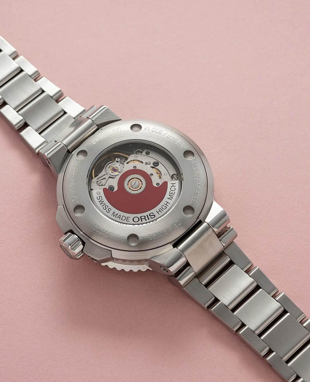 Многокомпонентный корпус из нержавеющей стали, вращающийся безельБезельВнешний ободок, закрепляющий стекло. В спортивных часах так называется поворотное кольцо с делениями на циферблате, выполняет роль таймера – замеряет отрезки времени на шкале. Неподвижный безель – элемент декора. Однонаправленно вращающийся безель на дайверских часах позволяет фиксировать моменты погружения и выныривания на поверхность. с минутной шкалой. Сапфировое стеклоСапфировое стеклоПрочный и надёжный материал из кристалла сапфира синтетического происхождения, характеризующийся особой твёрдостью и устойчивостью к царапинам и повреждениям., выпуклое с обеих сторон, внутреннее антибликовое покрытие. Прозрачная задняя крышка из минерального стеклаМинеральное стеклоМинеральное стекло представляет собой искусственно выращенный минерал кварца. Такое стекло отличается особой устойчивостью к повреждениям и царапинам. Уступает по некоторым качествам сапфировому стеклу.. Стрелки и метки с люминесцентным покрытиемЛюминесцентное покрытиеПозволяет считывать показания времени в темноте. Производители наносят на стрелки, часовые индексы, безель или поверхность циферблата светонакопительный состав, дающий холодное свечение.. Завинчивающаяся заводная головка. Калибр Oris 733 (на базе SW 200-1).