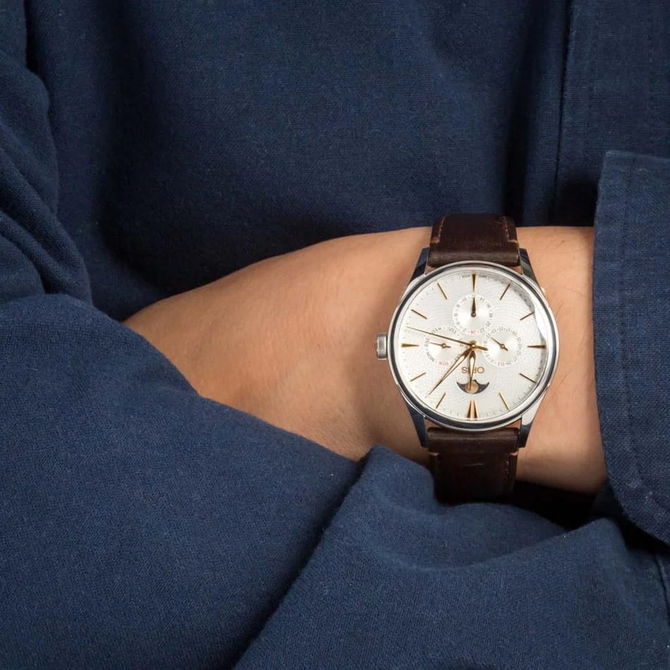 Artelier Complication часы с надежным автоматическим механизмом. Корпус часов изготовлен из нержавеющей стали. Минеральное стеклоМинеральное стеклоМинеральное стекло представляет собой искусственно выращенный минерал кварца. Такое стекло отличается особой устойчивостью к повреждениям и царапинам. Уступает по некоторым качествам сапфировому стеклу. с сапфировым напылением устойчивое к мелким механическим повреждениям. Влагозащита: 50 метров. Стрелки с люминесцентным покрытиемЛюминесцентное покрытиеПозволяет считывать показания времени в темноте. Производители наносят на стрелки, часовые индексы, безель или поверхность циферблата светонакопительный состав, дающий холодное свечение.. Кожаный ремень.