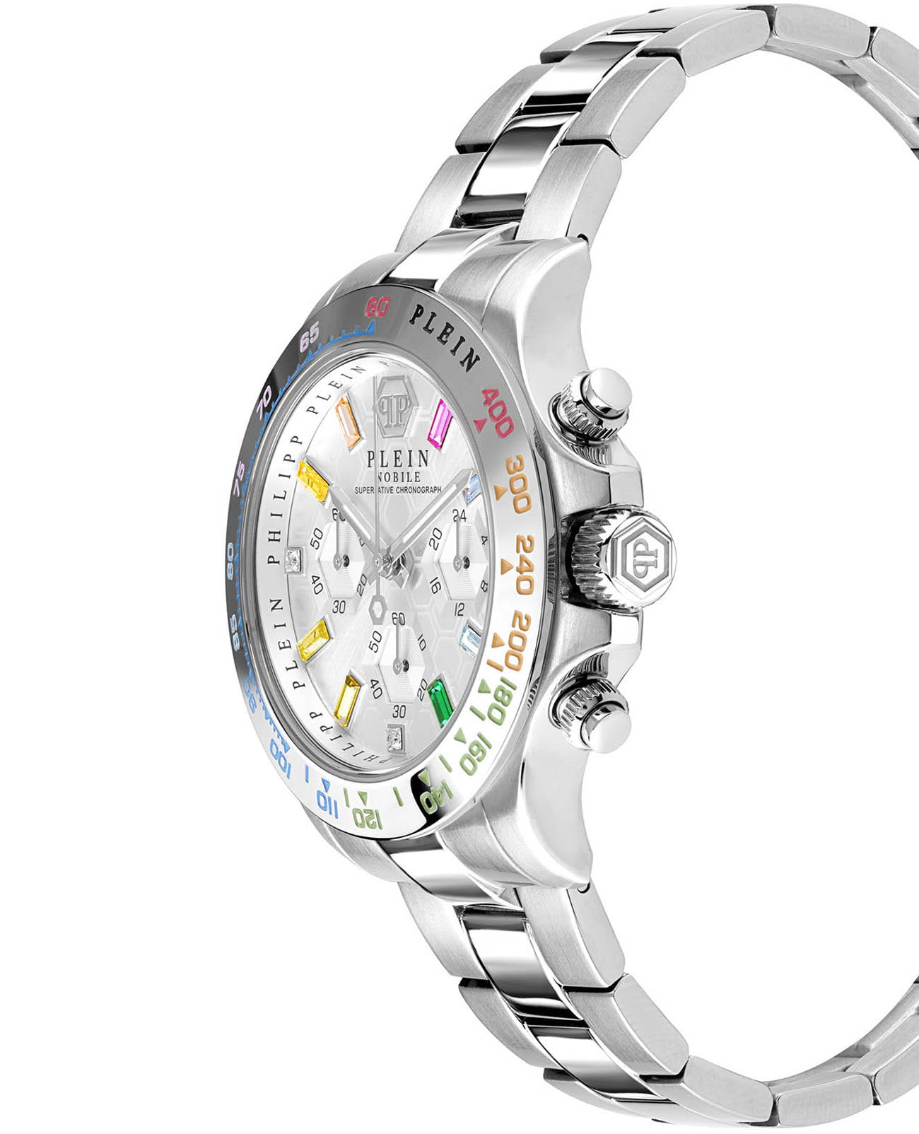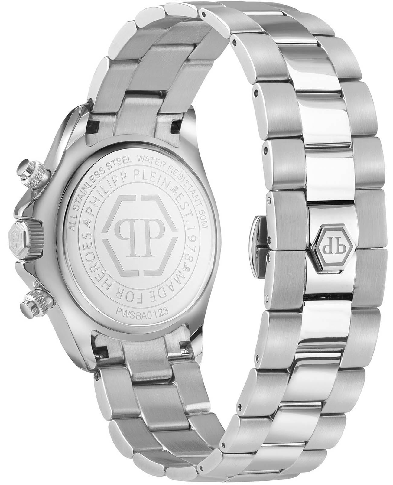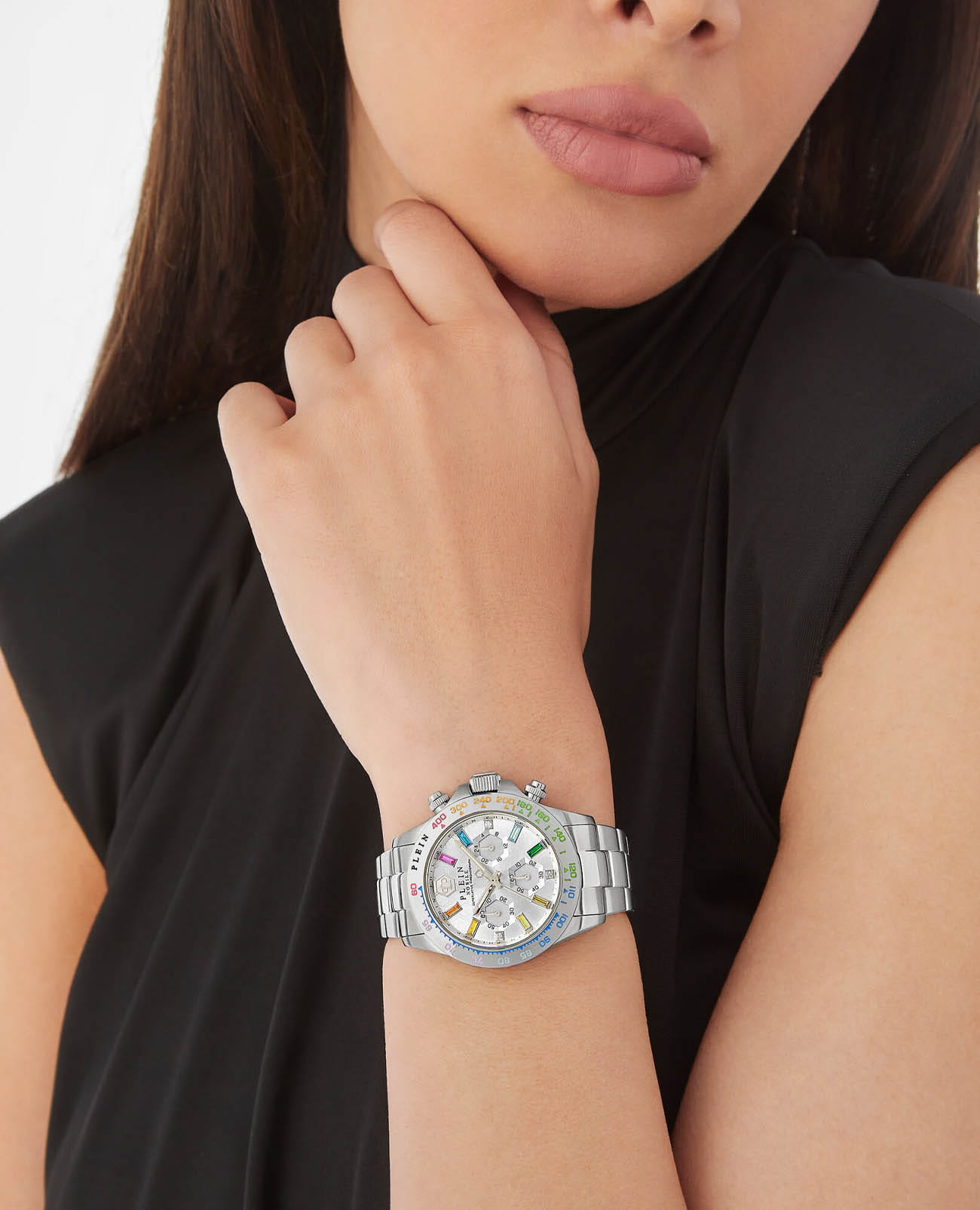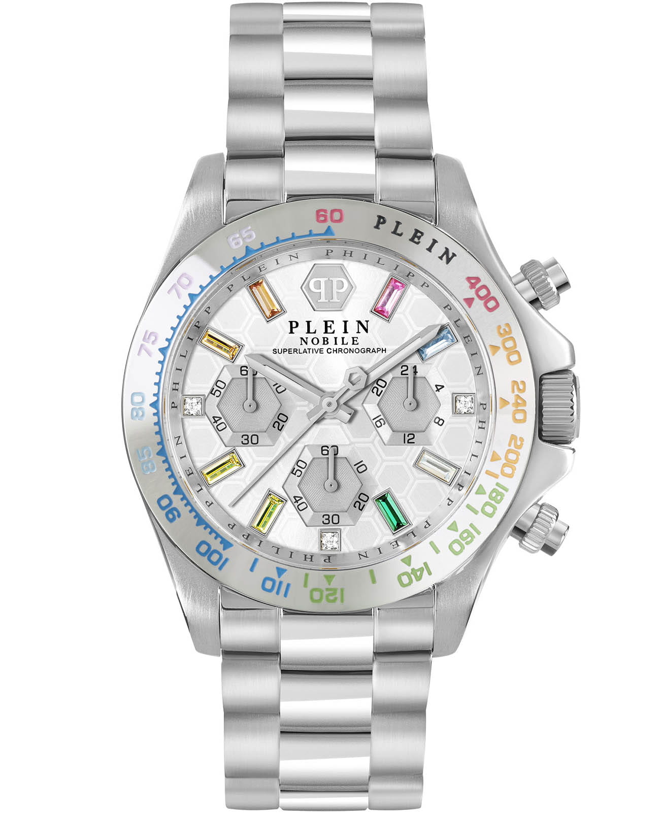 Яркие женские часы-хронографХронографФункция позволяет измерять отрезки времени с особой точностью: часы, минуты, секунды. Верным признаком хронографа является наличие на циферблате 3 дополнительных окошек-счётчиков. с секундомеромСекундомерСекундоме́р — прибор, способный измерять интервалы времени с точностью до долей секунды. Philipp Plein Nobile Lady PWSBA0123, кварцевый механизм с высокой точностью. 12 и 24-часовой формат времени. Класс водозащиты: 50 метров, позволит защитить корпус от случайных брызг или капель дождя. Корпус и браслет часов изготовлены из нержавеющей стали. Стрелки с люминесцентным покрытиемЛюминесцентное покрытиеПозволяет считывать показания времени в темноте. Производители наносят на стрелки, часовые индексы, безель или поверхность циферблата светонакопительный состав, дающий холодное свечение.. Стальной браслет на застёжке-бабочке с кнопкамиЗастёжка "бабочка"Такой вид застёжки дополняется предохранителями, помогающими избежать случайного раскрытия браслета. Обладают изящным исполнением. . Циферблат инкрустирован кристаллами Preciosa.