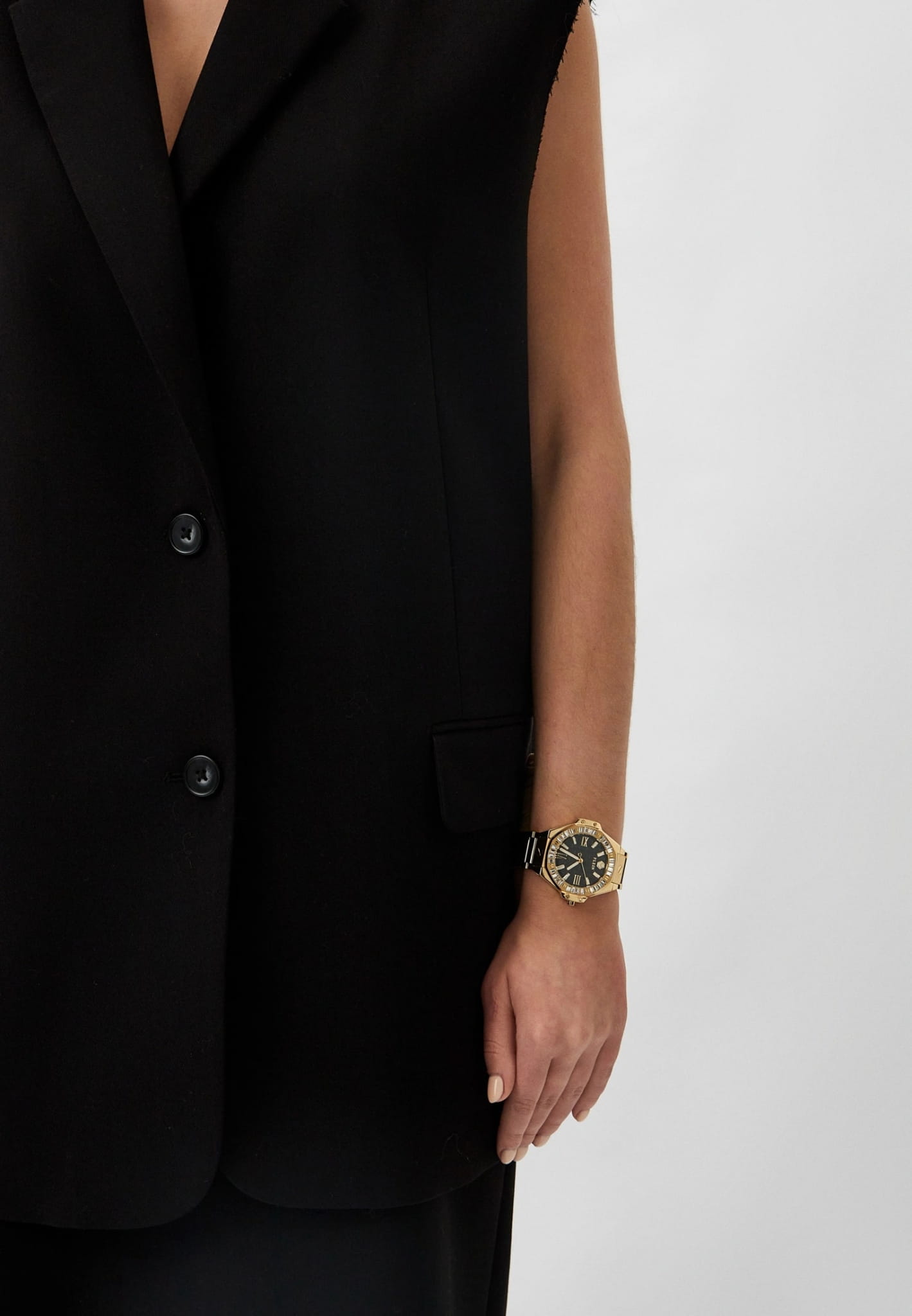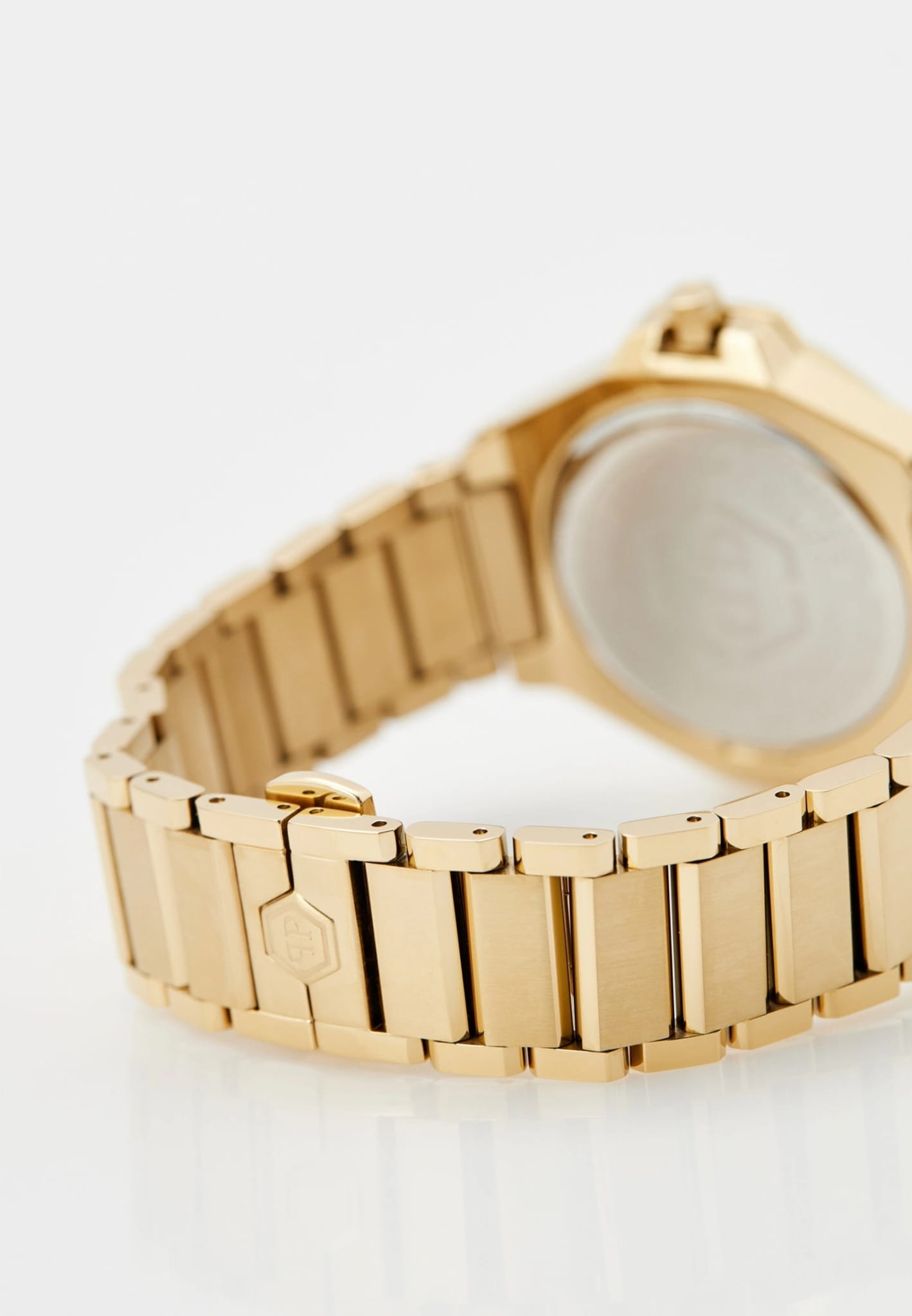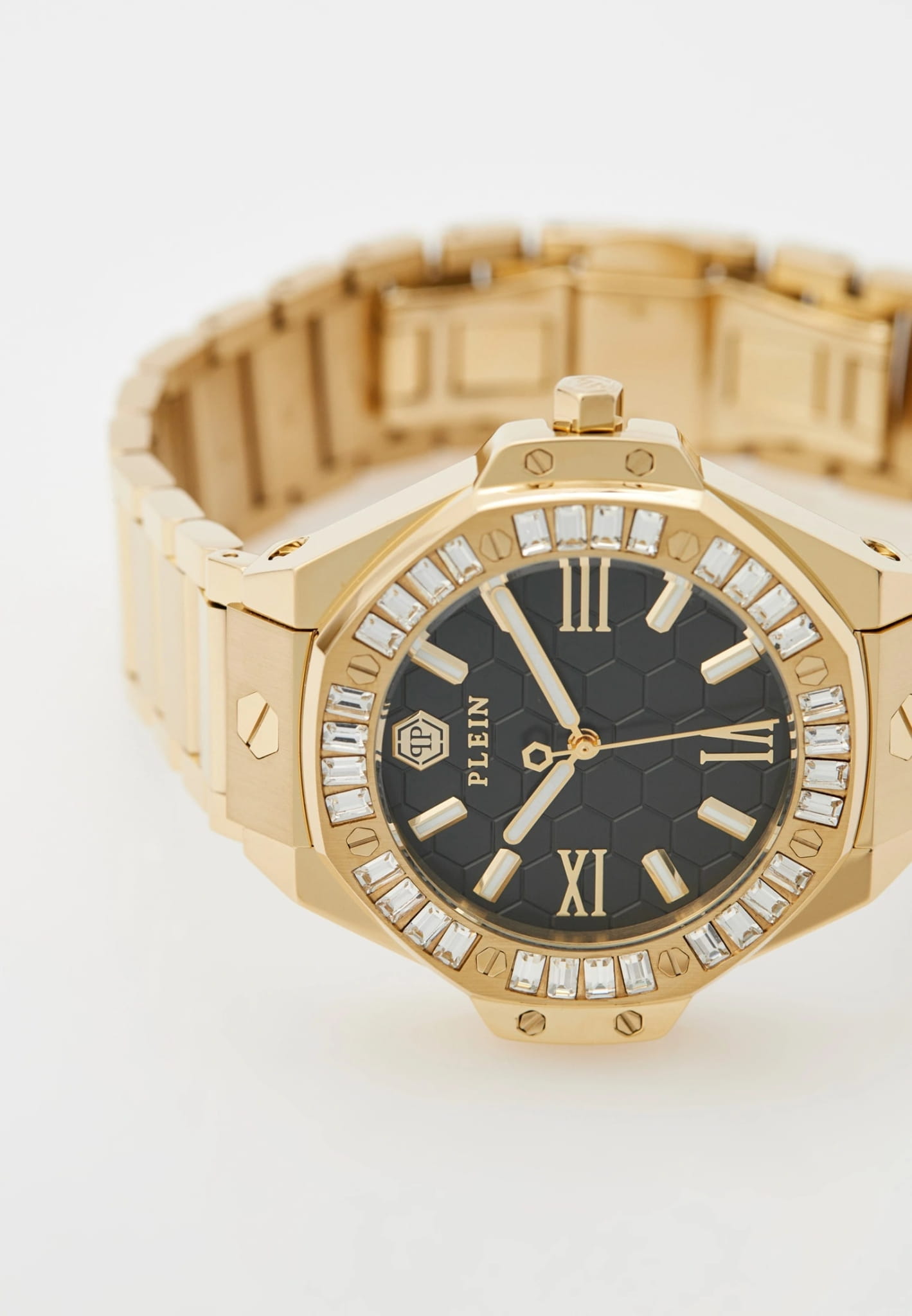 Philipp Plein Plein Lady Royal PWBDA0824 — это стильные женские часы, сочетающие современный дизайн и функциональность. Корпус диаметром 39 мм выполнен из нержавеющей стали с золотистым PVD-покрытиемPVDУльтратонкое покрытие наносится в технике вакуумного напыления, сочетает в себе нитрид титана особой прочности со слоем золота или оксида хрома. Несёт в себе декоративную или защитную функцию., что придаёт часам элегантный и роскошный вид. Минеральное стеклоМинеральное стеклоМинеральное стекло представляет собой искусственно выращенный минерал кварца. Такое стекло отличается особой устойчивостью к повреждениям и царапинам. Уступает по некоторым качествам сапфировому стеклу. защищает циферблат от царапин, сохраняя его внешний вид. Циферблат инкрустирован кристаллами. Чёрный циферблат с шестиугольной текстурой подчёркивает уникальный стиль бренда. Часовые метки в виде штрихов и классические стрелки обеспечивают удобное считывание времени. Часы оснащены кварцевым механизмом, который гарантирует точность хода. Водозащита до 5 ATM (50 метров) делает их идеальными для повседневного использования. Браслет из нержавеющей стали с золотистым PVD-покрытиемPVDУльтратонкое покрытие наносится в технике вакуумного напыления, сочетает в себе нитрид титана особой прочности со слоем золота или оксида хрома. Несёт в себе декоративную или защитную функцию. гармонично дополняет корпус на застёжке-бабочке с кнопкамиЗастёжка "бабочка"Такой вид застёжки дополняется предохранителями, помогающими избежать случайного раскрытия браслета. Обладают изящным исполнением. обеспечивает удобство и надёжность при ношении. Ширина браслета 16 мм завершает утончённый образ.