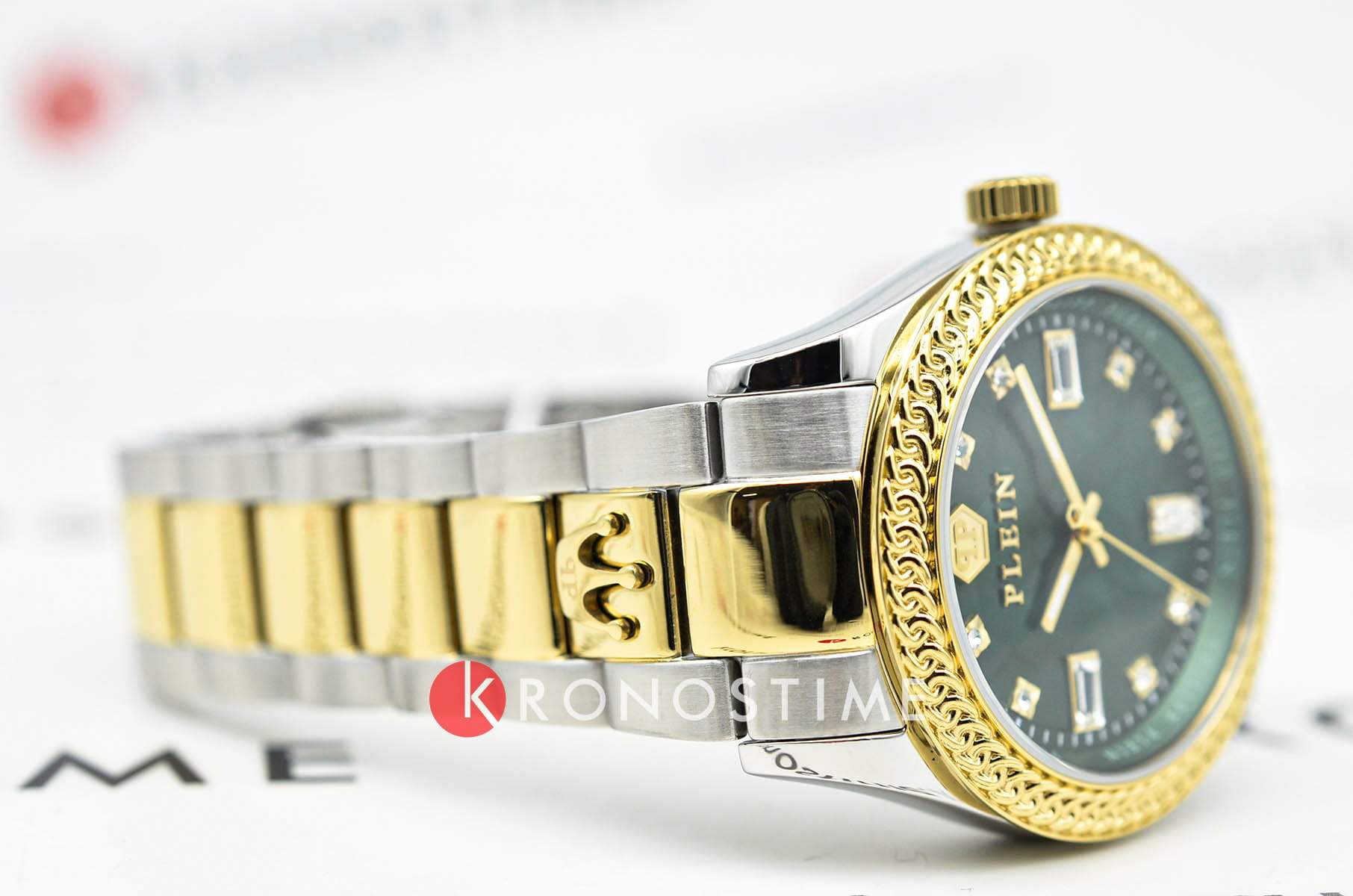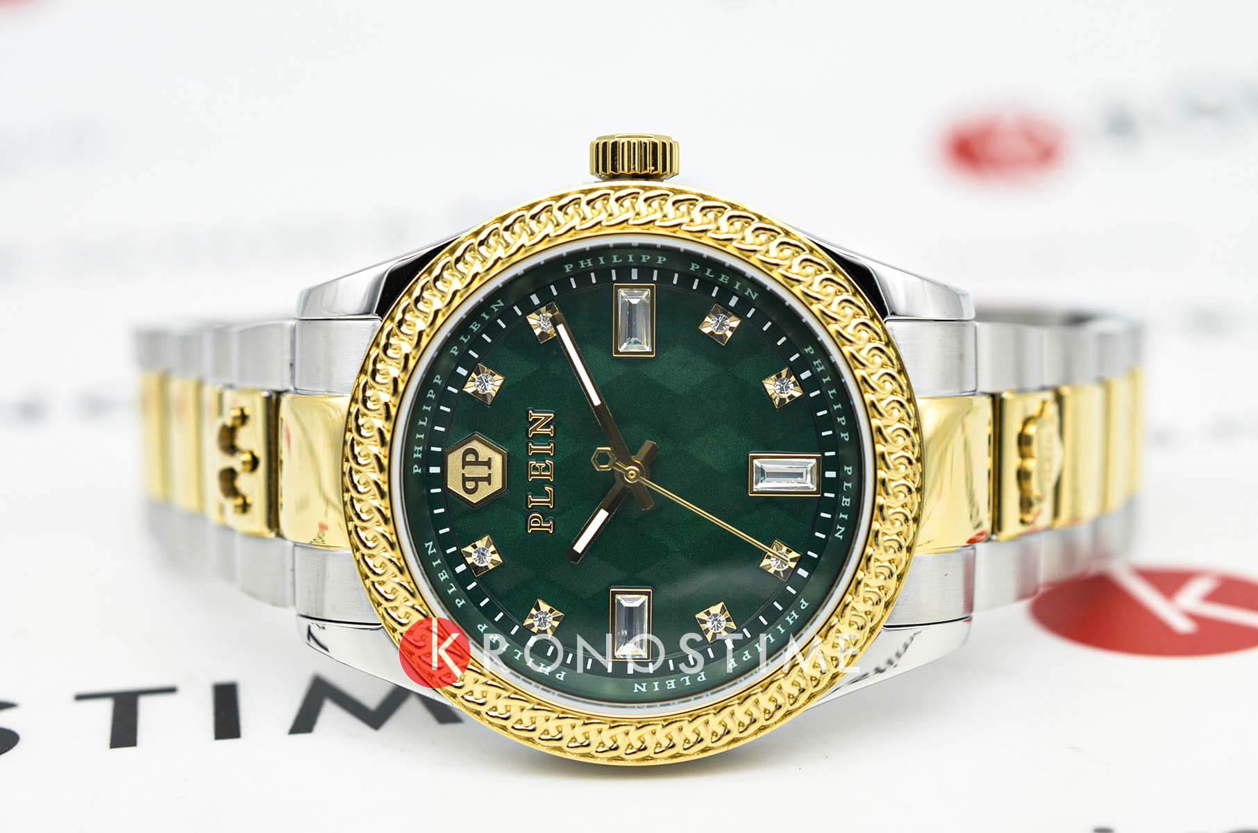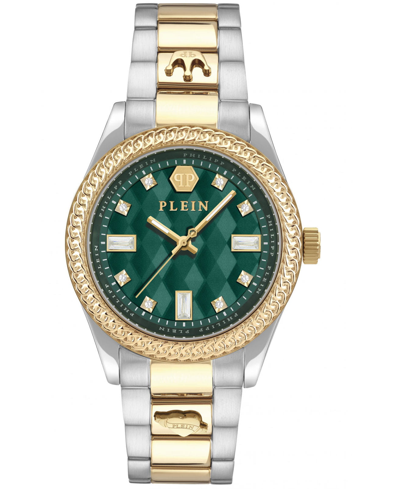 Часы Philipp Plein PWCDA0524 из коллекции Queen сочетают элегантность и функциональность. Корпус диаметром 38 мм выполнен из нержавеющей стали, придающим изделию роскошный вид. Зеленый циферблат украшен фирменным логотипом бренда в виде черепа на отметке 12 часов. БезельБезельВнешний ободок, закрепляющий стекло. В спортивных часах так называется поворотное кольцо с делениями на циферблате, выполняет роль таймера – замеряет отрезки времени на шкале. Неподвижный безель – элемент декора. Однонаправленно вращающийся безель на дайверских часах позволяет фиксировать моменты погружения и выныривания на поверхность. с IP-покрытиемIP-покрытиеМетод ионного напыления. Демонстрирует повышенную устойчивость к истиранию, окислению и химическим веществам. Под воздействием высокого давления и температуры около 1500°C молекулы металла надёжно соединяются с частицами корпуса часов..