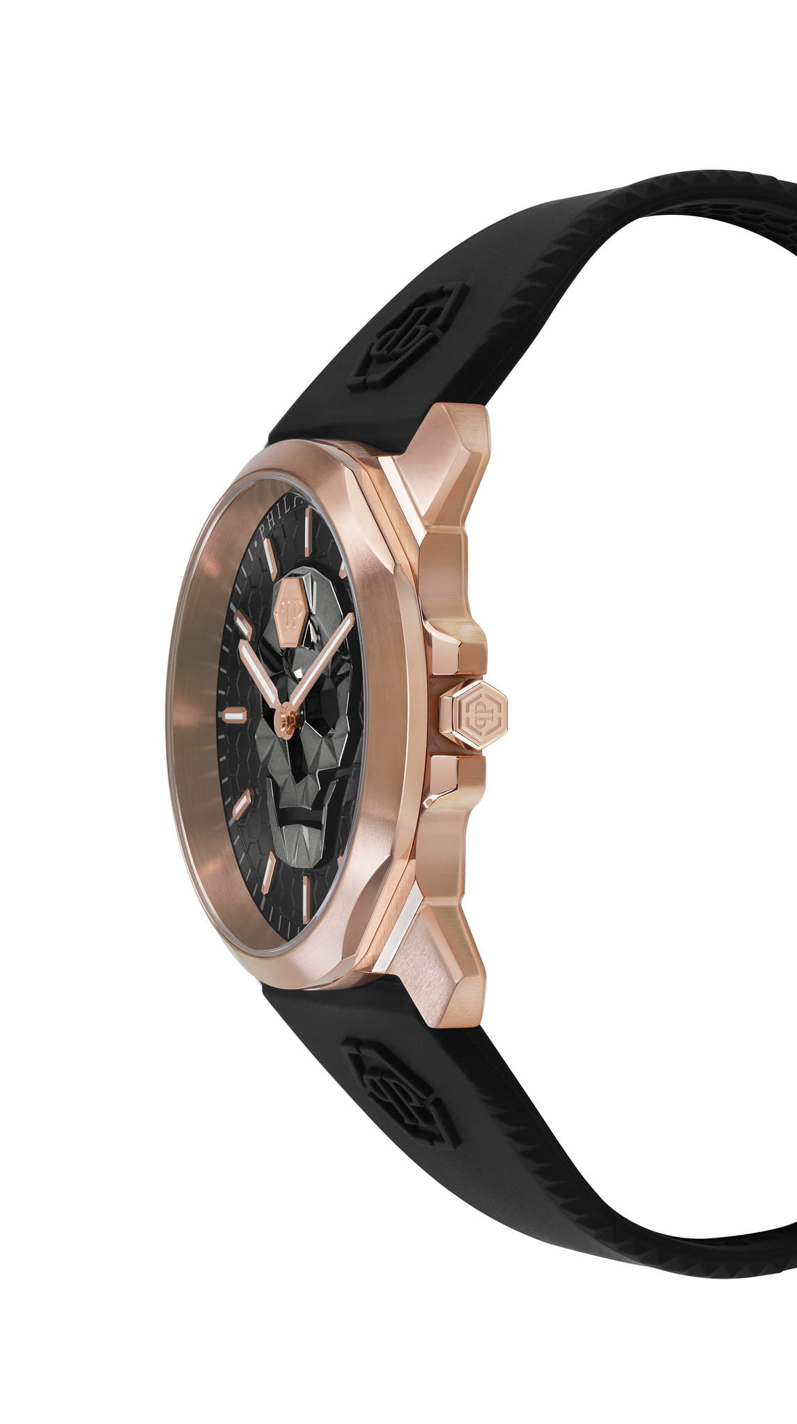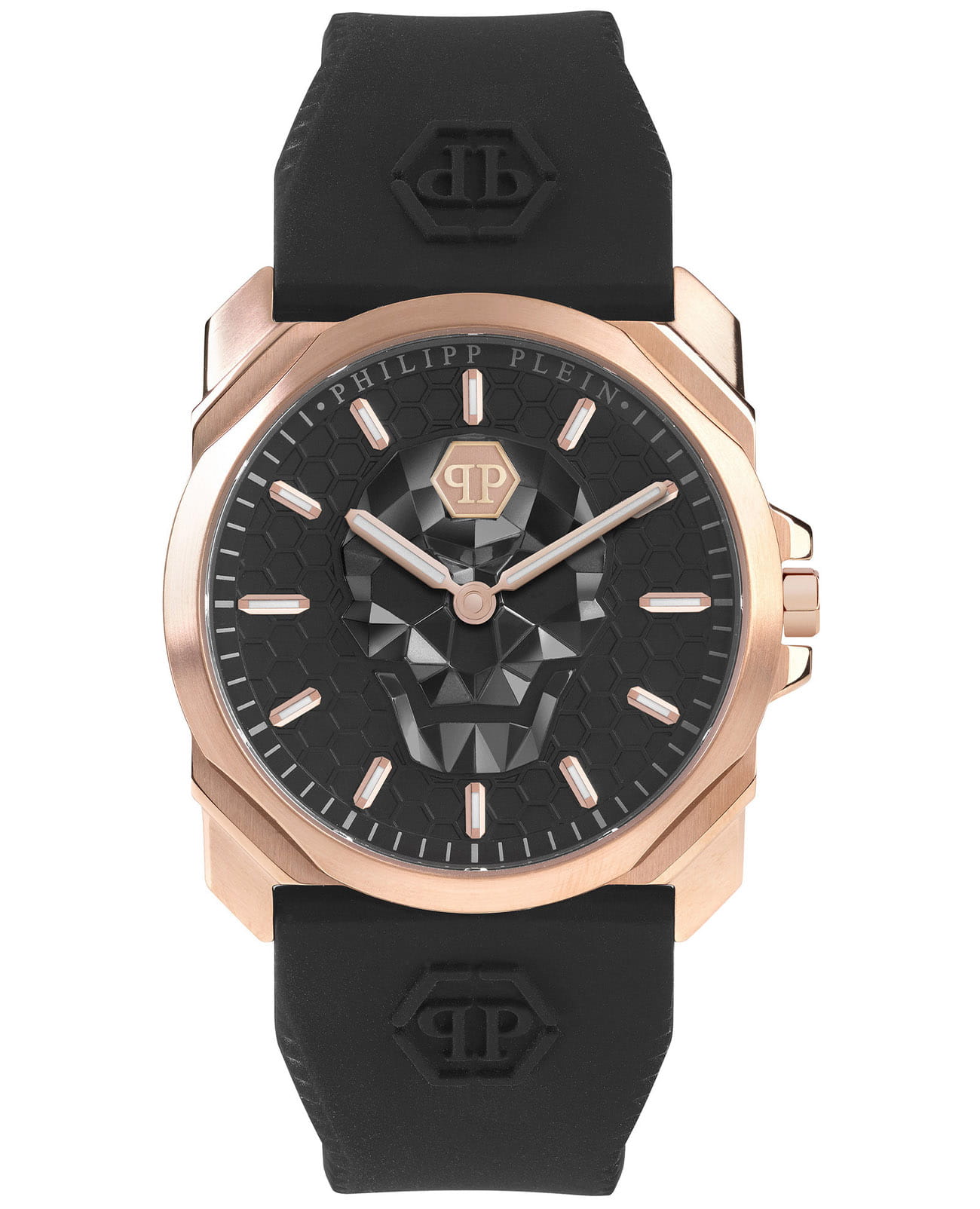 Мужские кварцевые часы с фирменным изображением черепа Philipp Plein The Skull King PWLAA0222, кварцевый механизм с высокой точностью. Класс водозащиты: 50 метров, позволит защитить корпус от случайных брызг или капель дождя. Корпус часов изготовлен из стали с IP-покрытиемIP-покрытиеМетод ионного напыления. Демонстрирует повышенную устойчивость к истиранию, окислению и химическим веществам. Под воздействием высокого давления и температуры около 1500°C молекулы металла надёжно соединяются с частицами корпуса часов. цвета розовое золото. Черный силиконовый ремешок шириной 26 мм, стандартная застежка. Прочное минеральное стеклоМинеральное стеклоМинеральное стекло представляет собой искусственно выращенный минерал кварца. Такое стекло отличается особой устойчивостью к повреждениям и царапинам. Уступает по некоторым качествам сапфировому стеклу. устойчивое к мелким механическим повреждениям.