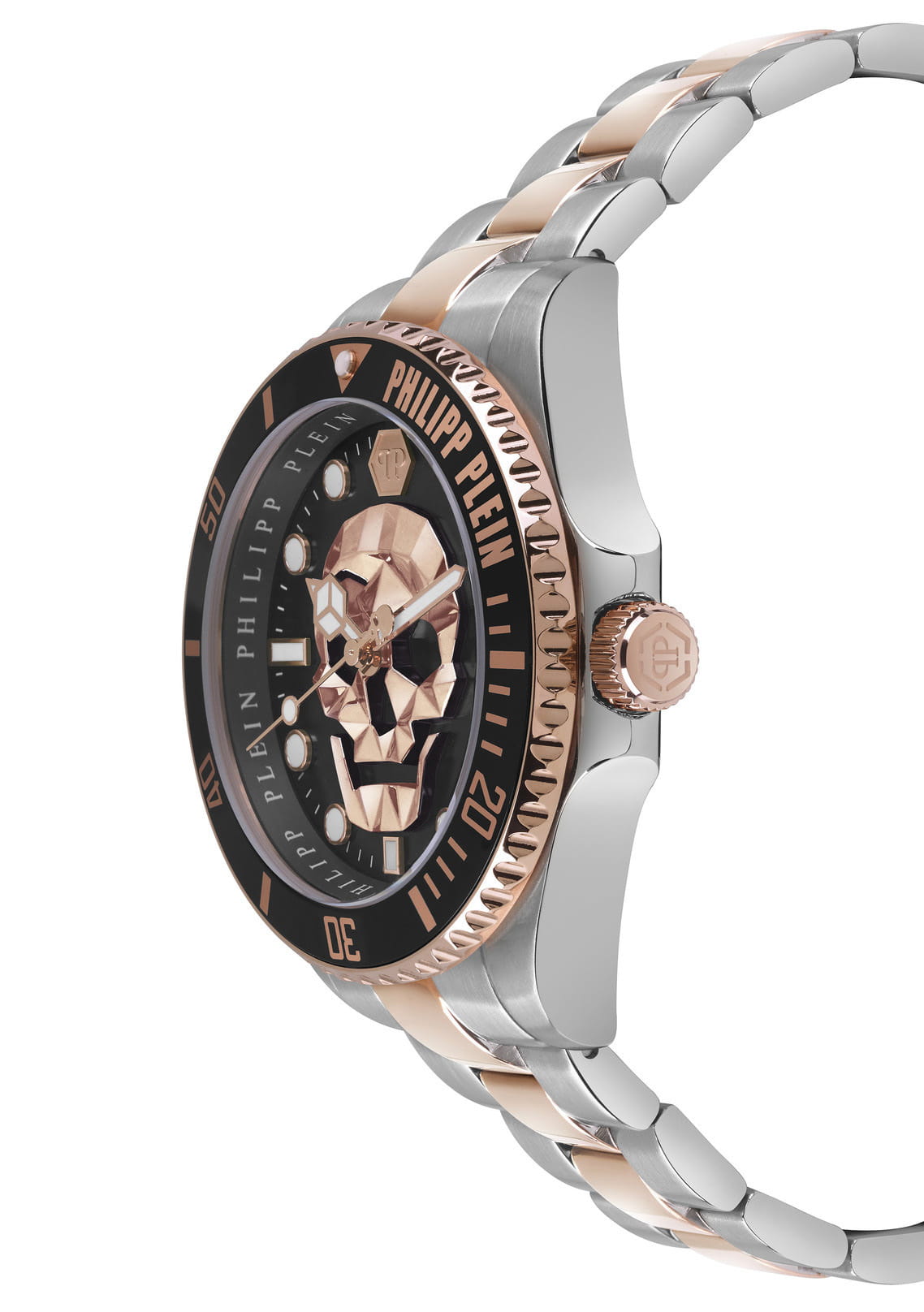 Яркие мужские часы с минеральным стекломМинеральное стеклоМинеральное стекло представляет собой искусственно выращенный минерал кварца. Такое стекло отличается особой устойчивостью к повреждениям и царапинам. Уступает по некоторым качествам сапфировому стеклу. Philipp Plein The Skull PWOAA0822, кварцевый механизм с высокой точностью. Класс водозащиты: 50 метров, позволит защитить корпус от случайных брызг или капель дождя. Корпус часов изготовлен из стали. Циферблат с метками в виде штрихов и точек украшен трехмерным граненым черепом и логотипом. Шестигранная заводная головка с защитой. Застёжка бабочка с кнопкамиЗастёжка "бабочка"Такой вид застёжки дополняется предохранителями, помогающими избежать случайного раскрытия браслета. Обладают изящным исполнением. .