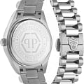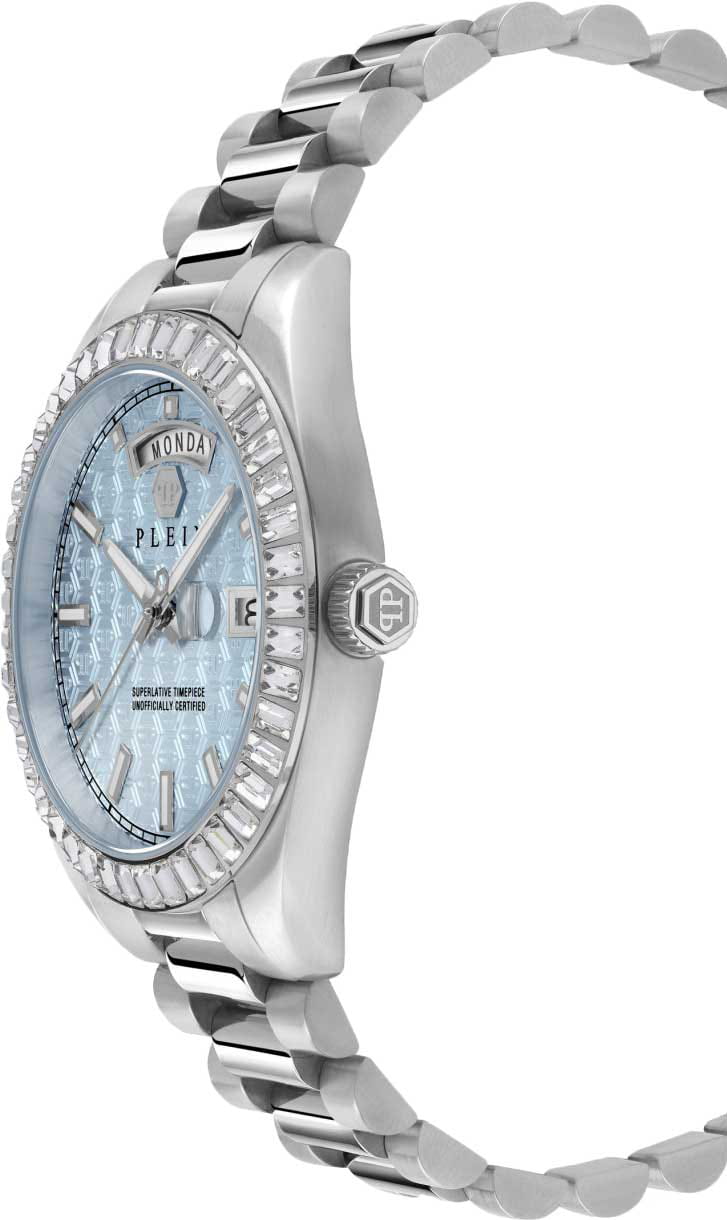 Мужские часы Philipp Plein PWPNA0524 с надежным кварцевым механизмом. Корпус часов изготовлен из стали. Минеральное стеклоМинеральное стеклоМинеральное стекло представляет собой искусственно выращенный минерал кварца. Такое стекло отличается особой устойчивостью к повреждениям и царапинам. Уступает по некоторым качествам сапфировому стеклу. устойчивое к мелким механическим повреждениям. Влагозащита: 50 метров, позволит защитить корпус от случайных брызг или капель дождя. Стрелки и метки с люминесцентным покрытиемЛюминесцентное покрытиеПозволяет считывать показания времени в темноте. Производители наносят на стрелки, часовые индексы, безель или поверхность циферблата светонакопительный состав, дающий холодное свечение.. Окошко даты с увеличительным стеклом находится в положении 3 часа.