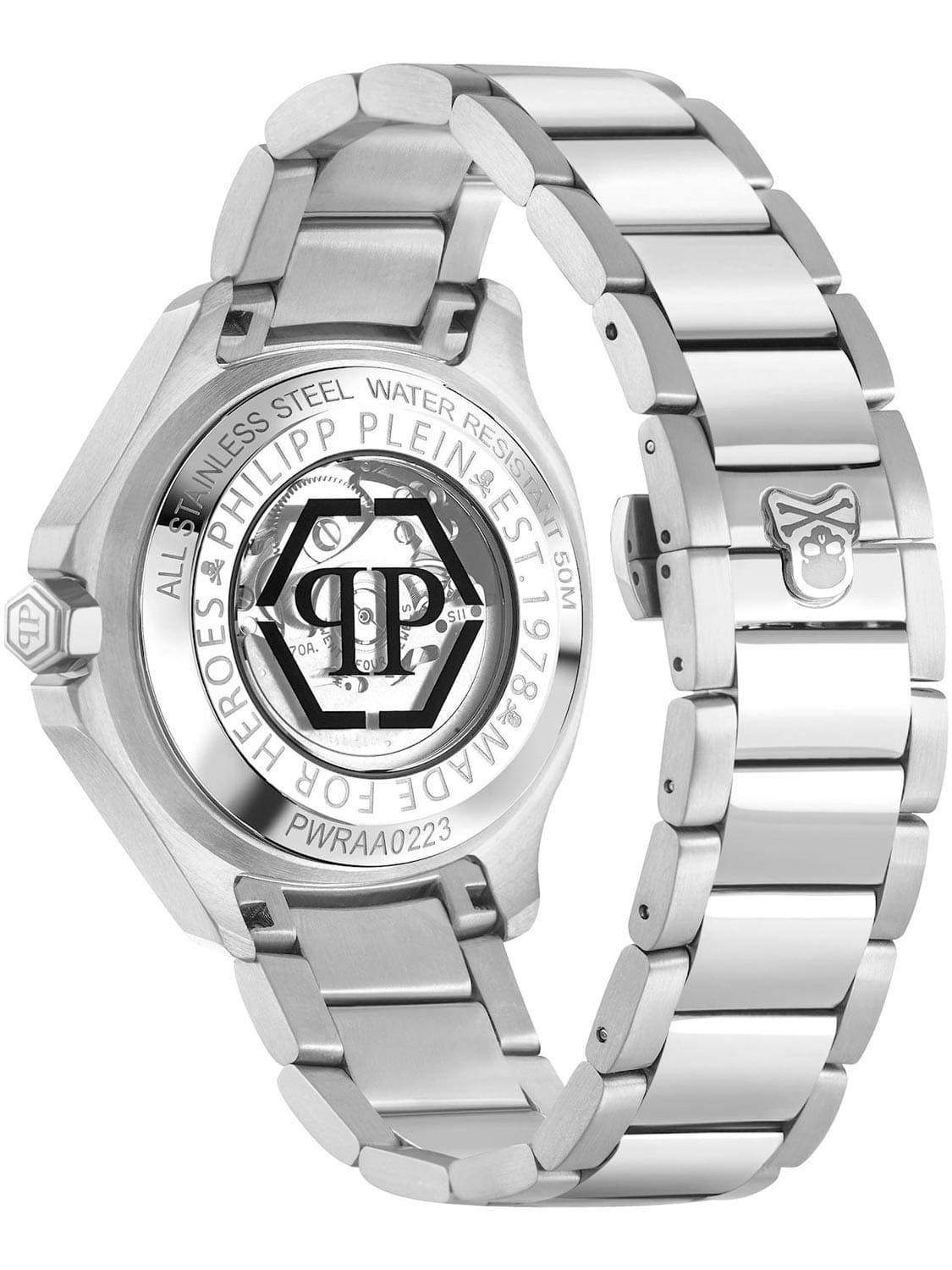 Яркие мужские часы с минеральным стекломМинеральное стеклоМинеральное стекло представляет собой искусственно выращенный минерал кварца. Такое стекло отличается особой устойчивостью к повреждениям и царапинам. Уступает по некоторым качествам сапфировому стеклу. Philipp Plein PWRAA0223, механический механизм с автоподзаводом. Класс водозащиты: 50 метров, позволит защитить корпус от случайных брызг или капель дождя. Корпус часов изготовлен из стали. Стрелки и метки с люминесцентным покрытиемЛюминесцентное покрытиеПозволяет считывать показания времени в темноте. Производители наносят на стрелки, часовые индексы, безель или поверхность циферблата светонакопительный состав, дающий холодное свечение.. Скелетонизированные. Часы с механизмом, из которого удалён весь «лишний» металл, с прозрачными циферблатом и задней крышкой. Застёжка бабочка с кнопкамиЗастёжка "бабочка"Такой вид застёжки дополняется предохранителями, помогающими избежать случайного раскрытия браслета. Обладают изящным исполнением.
