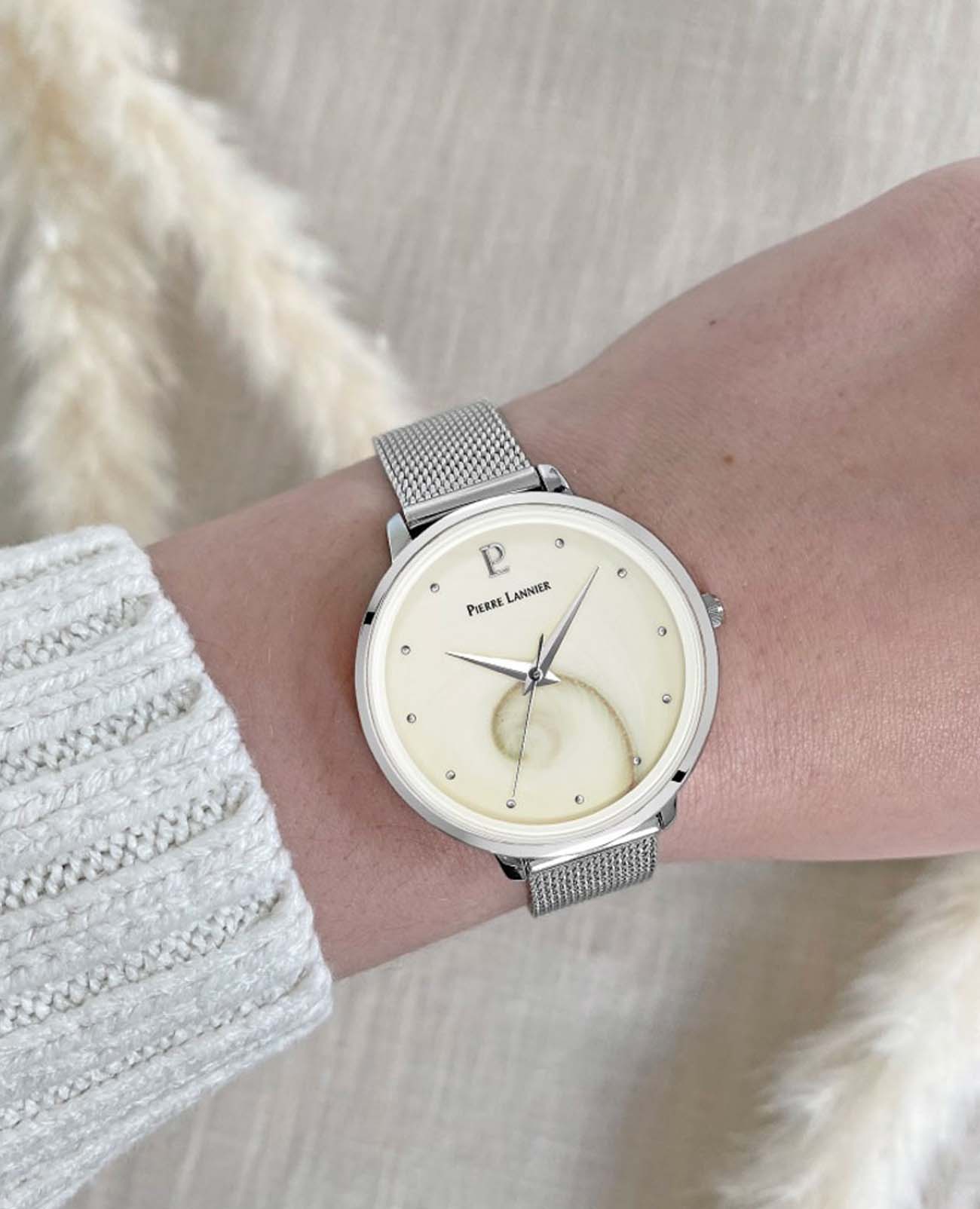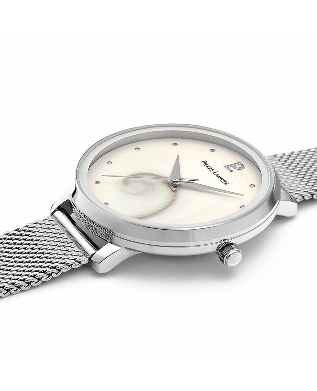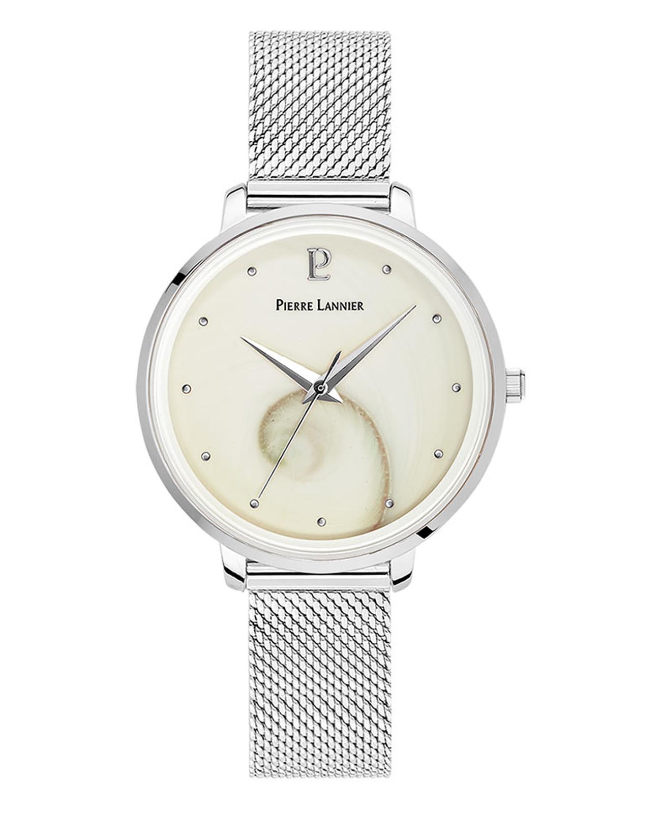 Женские часы Pierre Lannier Ocean 030L698, кварцевый механизм с высокой точностью. Прочное минеральное стеклоМинеральное стеклоМинеральное стекло представляет собой искусственно выращенный минерал кварца. Такое стекло отличается особой устойчивостью к повреждениям и царапинам. Уступает по некоторым качествам сапфировому стеклу., устойчивое к мелким механическим повреждениям. Круглый корпус выполнен из нержавеющей стали. Перламутровый циферблат украшает уникальное изображение глаза Сент-Люсии. Центральные часовая и минутная стрелки. Класс водозащиты: 30 метров, позволит защитить корпус от случайных брызг или капель дождя. Стальной браслет миланского плетения на раскладном замкеРаскладной замокДанный вариант застежки используется только на часах с металлическим браслетом. Отличительная особенность такого крепления в том, что длина браслета становится универсальной и вы можете самостоятельно отрегулировать нужный вам размер – застежка просто двигается по браслету часов..