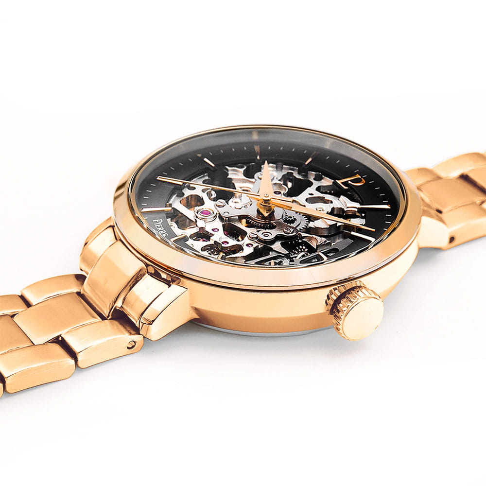 Женские механические часы с автоподзаводом Pierre Lannier Automatic 305D538. Минеральное стеклоМинеральное стеклоМинеральное стекло представляет собой искусственно выращенный минерал кварца. Такое стекло отличается особой устойчивостью к повреждениям и царапинам. Уступает по некоторым качествам сапфировому стеклу. устойчивое к мелким механическим повреждениям. Черный скелетонизированный циферблат. Центральные часовая, минутная и секундная стрелки. Корпус и браслет выполнен из нержавеющей стали с IP-покрытиемIP-покрытиеМетод ионного напыления. Демонстрирует повышенную устойчивость к истиранию, окислению и химическим веществам. Под воздействием высокого давления и температуры около 1500°C молекулы металла надёжно соединяются с частицами корпуса часов.. Водостойкость: 30 метров, позволит защитить корпус от случайных брызг или капель дождя. Стальной браслет с раскладной застёжкойРаскладная застёжкаТакой тип застёжки используется только на браслетах из металла. Она никогда не раскрывается полностью, происходит разделение на 2 и более частей. Раскладывающая застёжка снизит вероятность потери часов к минимуму..