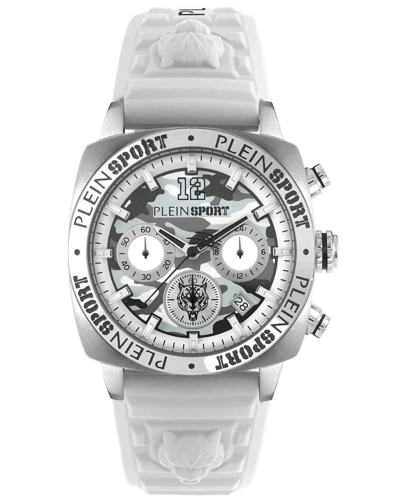 Немецкие мужские кварцевые часы-хронографХронографФункция позволяет измерять отрезки времени с особой точностью: часы, минуты, секунды. Верным признаком хронографа является наличие на циферблате 3 дополнительных окошек-счётчиков. с секундомеромСекундомерСекундоме́р — прибор, способный измерять интервалы времени с точностью до долей секунды. Plein Sport Wildcat PSGBA0123, кварцевый механизм с высокой точностью. Класс водозащиты: 50 метров, позволит защитить корпус от случайных брызг или капель дождя. Корпус часов изготовлен из стали. Стрелки и метки с люминесцентным покрытиемЛюминесцентное покрытиеПозволяет считывать показания времени в темноте. Производители наносят на стрелки, часовые индексы, безель или поверхность циферблата светонакопительный состав, дающий холодное свечение.. Силиконовый ремешок на стандартной застёжке. БезельБезельВнешний ободок, закрепляющий стекло. В спортивных часах так называется поворотное кольцо с делениями на циферблате, выполняет роль таймера – замеряет отрезки времени на шкале. Неподвижный безель – элемент декора. Однонаправленно вращающийся безель на дайверских часах позволяет фиксировать моменты погружения и выныривания на поверхность. с IP-покрытиемIP-покрытиеМетод ионного напыления. Демонстрирует повышенную устойчивость к истиранию, окислению и химическим веществам. Под воздействием высокого давления и температуры около 1500°C молекулы металла надёжно соединяются с частицами корпуса часов.. Окошко даты находится в положении между 4 и 5 часов.