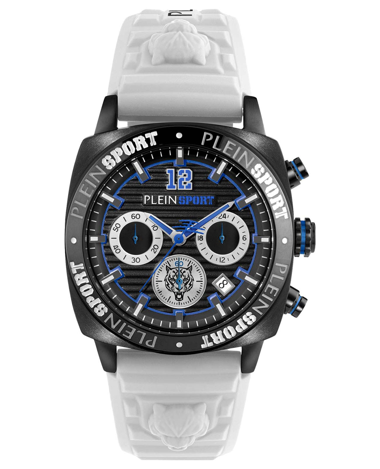 Немецкие мужские кварцевые часы-хронографХронографФункция позволяет измерять отрезки времени с особой точностью: часы, минуты, секунды. Верным признаком хронографа является наличие на циферблате 3 дополнительных окошек-счётчиков. с секундомеромСекундомерСекундоме́р — прибор, способный измерять интервалы времени с точностью до долей секунды. Plein Sport Wildcat PSGBA0823, кварцевый механизм с высокой точностью. Класс водозащиты: 50 метров, позволит защитить корпус от случайных брызг или капель дождя. Корпус часов изготовлен из стали с IP-покрытиемIP-покрытиеМетод ионного напыления. Демонстрирует повышенную устойчивость к истиранию, окислению и химическим веществам. Под воздействием высокого давления и температуры около 1500°C молекулы металла надёжно соединяются с частицами корпуса часов.. Стрелки и метки с люминесцентным покрытиемЛюминесцентное покрытиеПозволяет считывать показания времени в темноте. Производители наносят на стрелки, часовые индексы, безель или поверхность циферблата светонакопительный состав, дающий холодное свечение.. Силиконовый ремешок на стандартной застёжке. Окошко даты находится в положении между 4 и 5 часов.