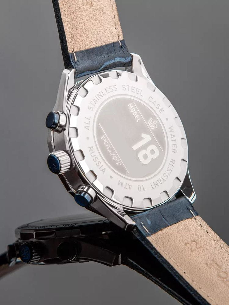 Poljot 6S21.181252 — яркие мужские часы с выразительным спортивным характером и акцентом на функциональность. Корпус из нержавеющей стали придаёт модели надёжность и солидность, а насыщенный циферблат с контрастными счётчиками хронографаХронографФункция позволяет измерять отрезки времени с особой точностью: часы, минуты, секунды. Верным признаком хронографа является наличие на циферблате 3 дополнительных окошек-счётчиков. создаёт динамичный и энергичный облик. БезельБезельВнешний ободок, закрепляющий стекло. В спортивных часах так называется поворотное кольцо с делениями на циферблате, выполняет роль таймера – замеряет отрезки времени на шкале. Неподвижный безель – элемент декора. Однонаправленно вращающийся безель на дайверских часах позволяет фиксировать моменты погружения и выныривания на поверхность. с PVD-покрытиемPVDУльтратонкое покрытие наносится в технике вакуумного напыления, сочетает в себе нитрид титана особой прочности со слоем золота или оксида хрома. Несёт в себе декоративную или защитную функцию.. Широкие стрелки и метки с люминесцентным покрытиемЛюминесцентное покрытиеПозволяет считывать показания времени в темноте. Производители наносят на стрелки, часовые индексы, безель или поверхность циферблата светонакопительный состав, дающий холодное свечение. обеспечивают отличную читаемость в любых условиях, а внешний обод с минутной шкалой подчёркивает спортивный стиль. Окно даты добавляет практичности. Прочное минеральное стеклоМинеральное стеклоМинеральное стекло представляет собой искусственно выращенный минерал кварца. Такое стекло отличается особой устойчивостью к повреждениям и царапинам. Уступает по некоторым качествам сапфировому стеклу. надёжно защищает циферблат от повреждений, а ремешок из натуральной кожи гармонично дополняет контрастную цветовую палитру. Poljot — это смелое сочетание спортивной энергии, точности и современного дизайна для активного и уверенного мужчины.