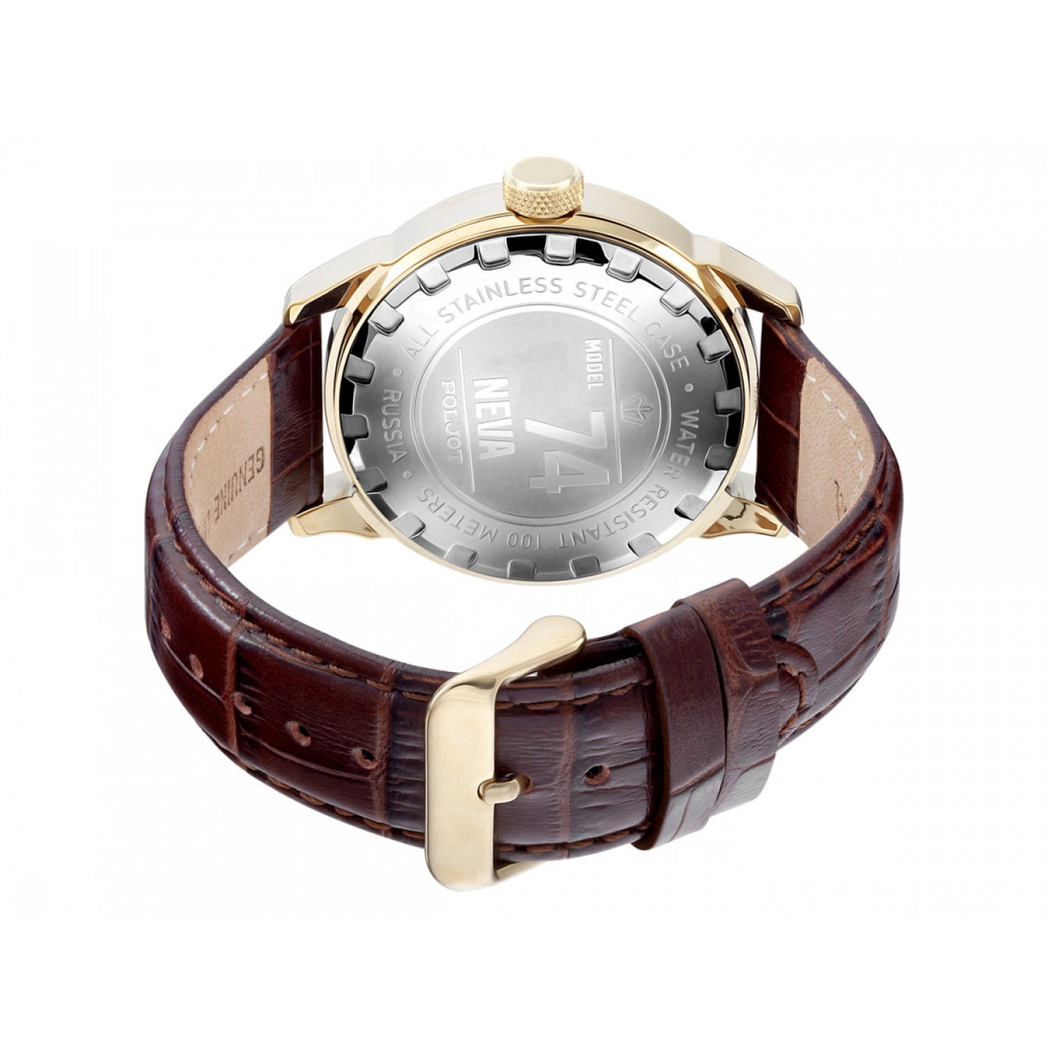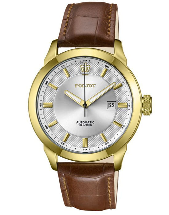 Poljot 8215.746089 — элегантные механические мужские часы с автоподзаводом, сочетающие традиции отечественного часового производства и классический дизайн. Корпус из нержавеющей стали с тёплым золотистым с PVD-покрытиемPVDУльтратонкое покрытие наносится в технике вакуумного напыления, сочетает в себе нитрид титана особой прочности со слоем золота или оксида хрома. Несёт в себе декоративную или защитную функцию. придаёт модели благородный характер, а серебристый циферблат с чёткой разметкой и аккуратным окном даты на позиции «3 часа» подчёркивает функциональную строгость стиля. Надёжный механизм с автоподзаводом обеспечивает плавный ход стрелок и стабильную работу. Прочное минеральное стеклоМинеральное стеклоМинеральное стекло представляет собой искусственно выращенный минерал кварца. Такое стекло отличается особой устойчивостью к повреждениям и царапинам. Уступает по некоторым качествам сапфировому стеклу. защищает циферблат от повреждений, а ремешок из натуральной кожи с классической пряжкой добавляет образу утончённости и комфорта. Poljot — это воплощение надёжности, традиции и сдержанной элегантности, идеально подходящее для повседневного делового стиля.