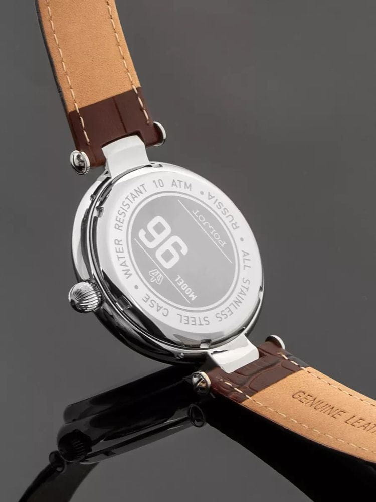 Poljot 8215.961158 “Baikal” — механические мужские часы с автоподзаводом, воплощающие традиции российского часового искусства и строгость классического дизайна. Крупный корпус из нержавеющей стали с характерными ушками придаёт модели мощный и узнаваемый силуэт, а насыщенный циферблат с аккуратной разметкой и окном даты на позиции «3 часов» подчёркивает лаконичность стиля. Механизм с автоподзаводом обеспечивает стабильную работу и плавное движение стрелок. Прочное минеральное стеклоМинеральное стеклоМинеральное стекло представляет собой искусственно выращенный минерал кварца. Такое стекло отличается особой устойчивостью к повреждениям и царапинам. Уступает по некоторым качествам сапфировому стеклу. надёжно защищает циферблат, а ремешок из натуральной кожи гарантирует комфорт и благородный внешний вид. Poljot — это часы для тех, кто ценит надёжность, традиции и спокойную уверенность в каждой детали.