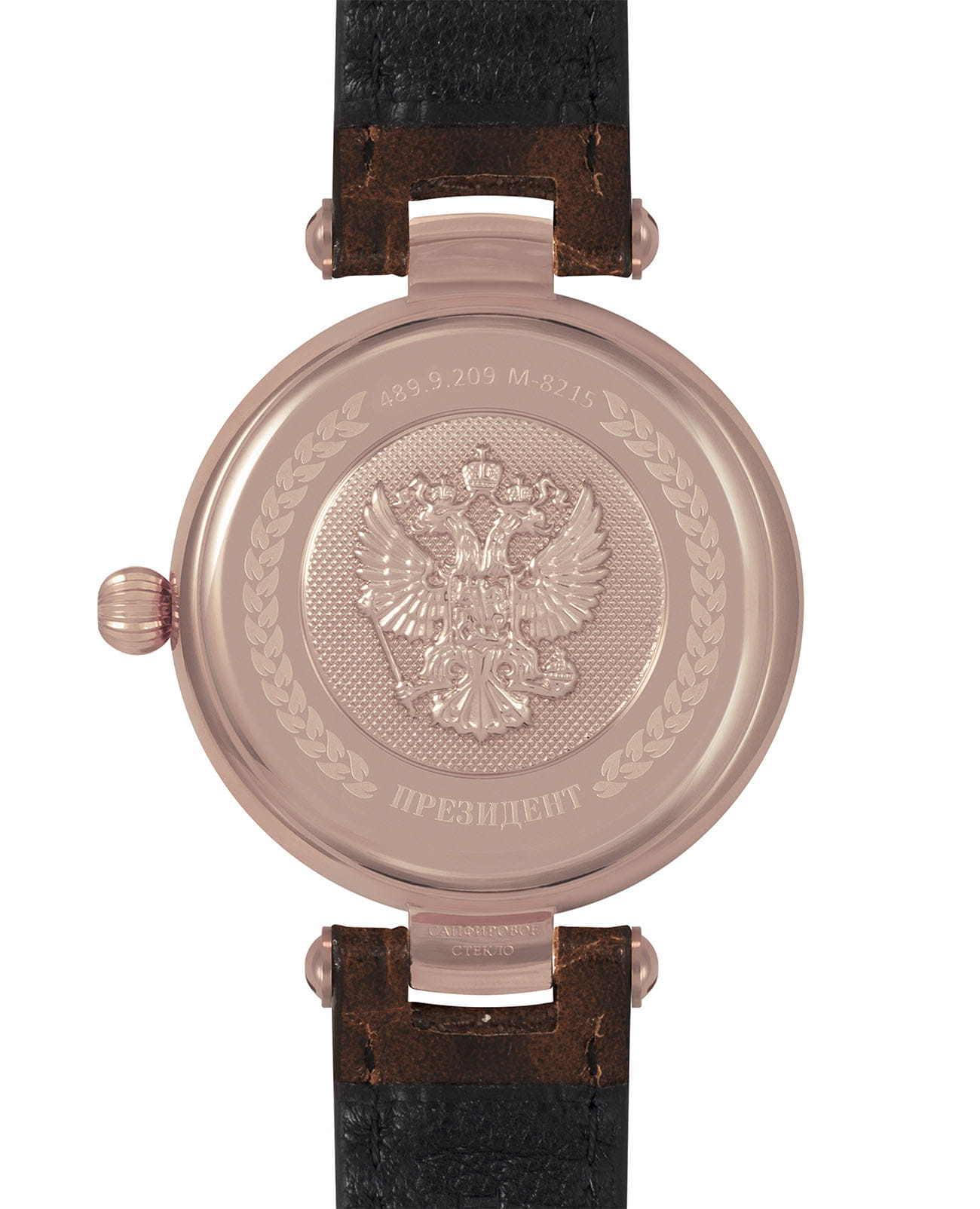 Круглые механические часы из коллекции «Президент» — это воплощение стиля и безупречного вкуса. Модель выполнена в форме с розовым золотом, а корпус диаметром 42 мм с толщиной 14 мм защищён сапфировым стекломСапфировое стеклоПрочный и надёжный материал из кристалла сапфира синтетического происхождения, характеризующийся особой твёрдостью и устойчивостью к царапинам и повреждениям., устойчивым к царапинам и обеспечивающим чёткое восприятие информации при любом освещении. Циферблат украшен кристаллами Swarovski. Часы оснащены механизмом с автоподзаводом, гарантирующим точность и надёжность. В комплект поставки входит подарочный футляр, паспорт с гарантийным талоном и фирменный пакет, что делает модель идеальным выбором для подарка. Задняя крышка с чеканкой Герба России подчёркивает национальную принадлежность и уникальность модели. Кожаный ремешок шириной 20 мм дополнен классической застёжкой, обеспечивая комфорт и элегантный стиль. Часы водонепроницаемы до 30 метров (), что позволяет использовать их в повседневных условиях — при мытье рук или под лёгким дождём. Эти часы станут универсальным аксессуаром для тех, кто ценит сочетание стиля, качества и символики — идеальный выбор для делового образа и торжественных случаев.