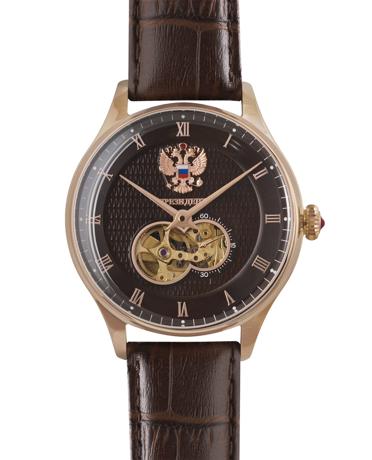 Мужские часы из коллекции «Президент» — это классический аксессуар, сочетающий в себе элегантность и надёжность. Модель выполнена в круглой форме с корпусом диаметром 42,5 мм и толщиной 16,3 мм, защищённым минеральным стекломМинеральное стеклоМинеральное стекло представляет собой искусственно выращенный минерал кварца. Такое стекло отличается особой устойчивостью к повреждениям и царапинам. Уступает по некоторым качествам сапфировому стеклу., устойчивым к мелким повреждениям. Браслет коричневого цвета изготовлен из натуральной кожи и дополнен стандартной застёжкой, что делает его удобным и практичным для повседневного использования. Часы оснащены механизмом с автоподзаводом, обеспечивающим точность хода и минимальное обслуживание. Прозрачная задняя крышка украшена изображением Герба России, что подчёркивает национальную принадлежность и уникальность модели. Водонепроницаемость позволяет использовать модель в повседневных условиях — при мытье рук или под лёгким дождём. Эти часы станут универсальным аксессуаром для тех, кто ценит сочетание стиля, качества и символики — идеальный выбор для уверенных в себе мужчин, следящих за своим имиджем и предпочитающих выделяться.